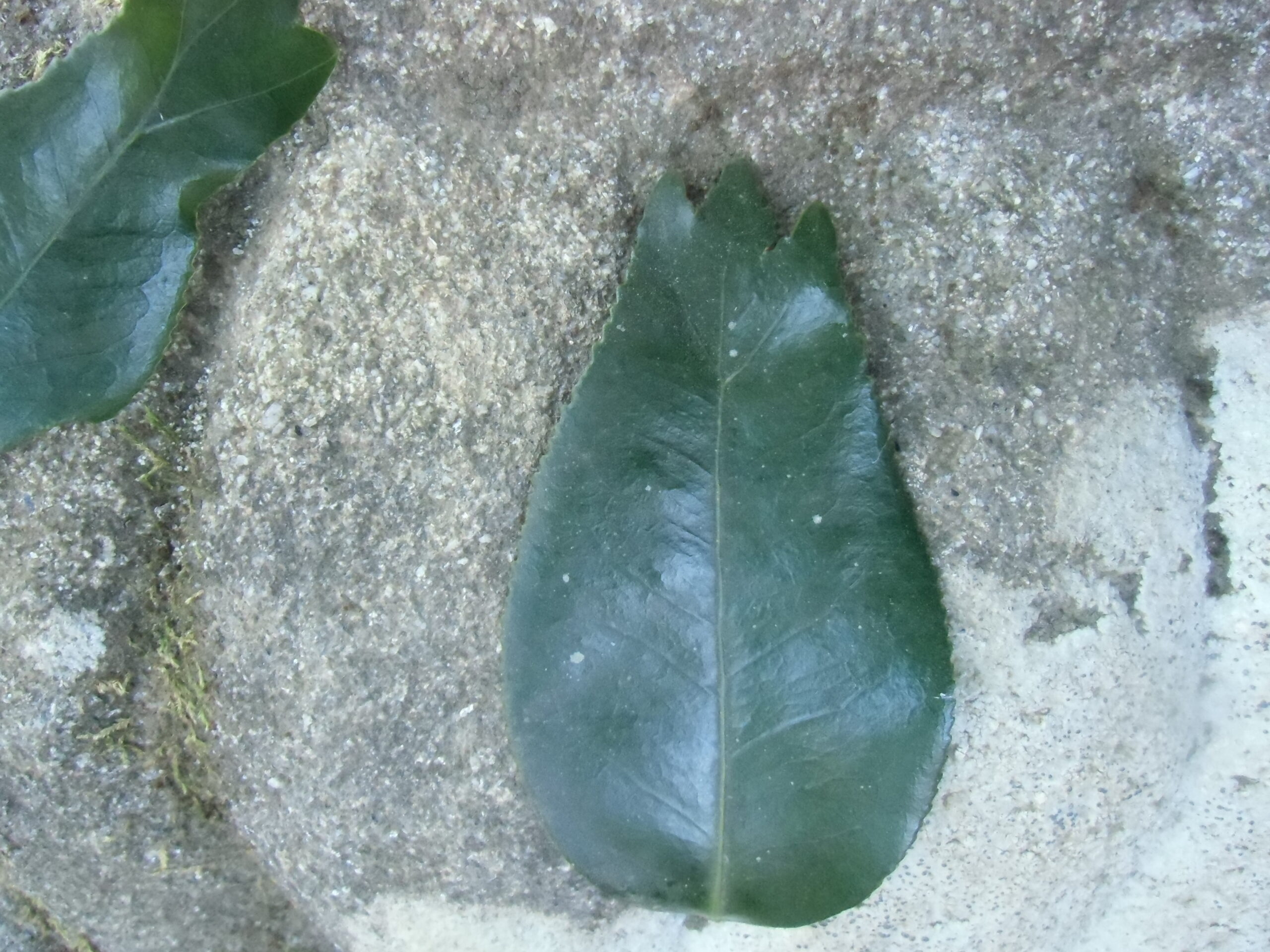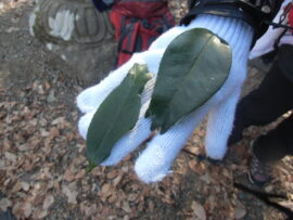 稲荷山登山口にある「金魚ツバキ」の葉。葉の先が金魚の尾のように分かれています。