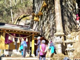 この神社の後方にある大岩石が「石」という字に割れていて、その割れた隙間を三回通れば幸運が開けると言われています。皆さん、三回通ってらしたので幸運が訪れることと思います。