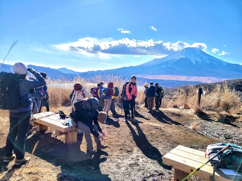 石割山から急でざれた斜面を下っていき、少しなだらかな道を行くと平尾山に到着です。ここで、ランチタイムにしました。雄大な富士山を眺めながらのランチは最高です。