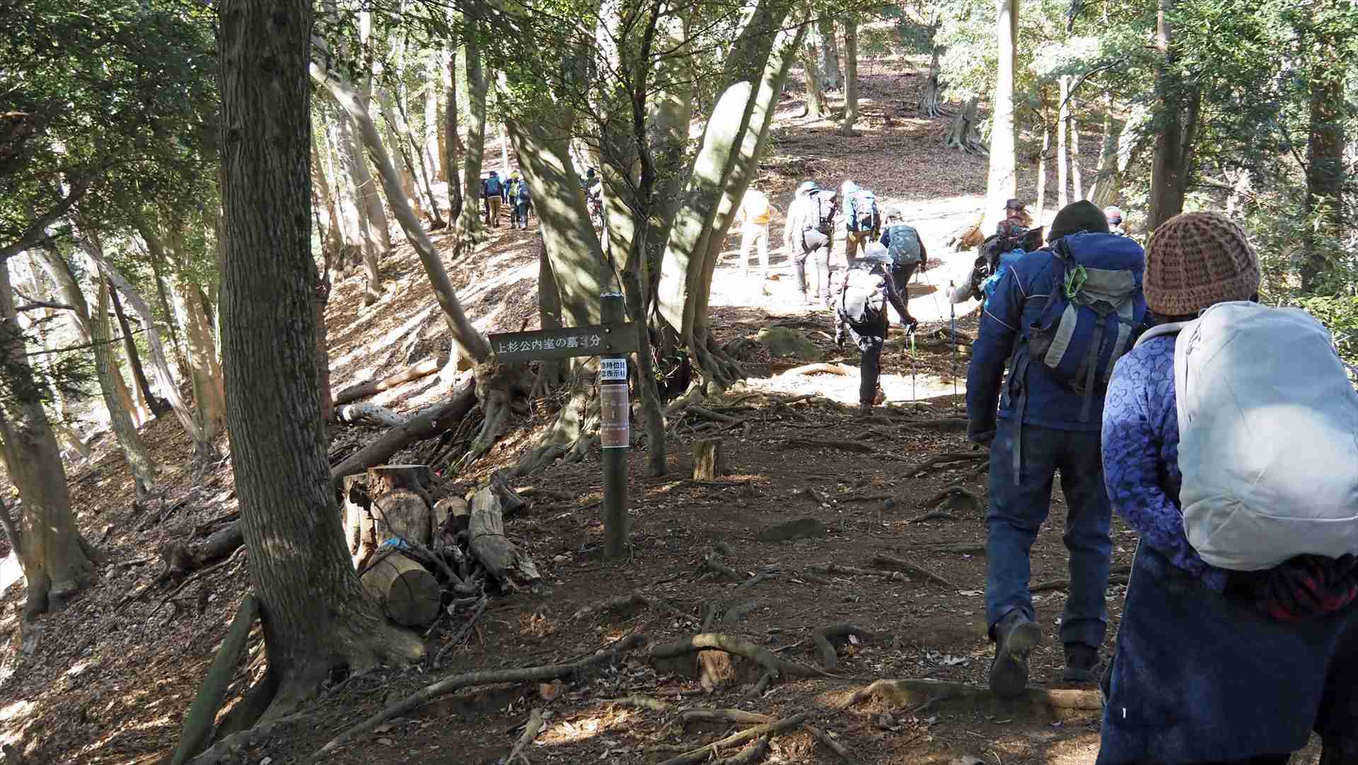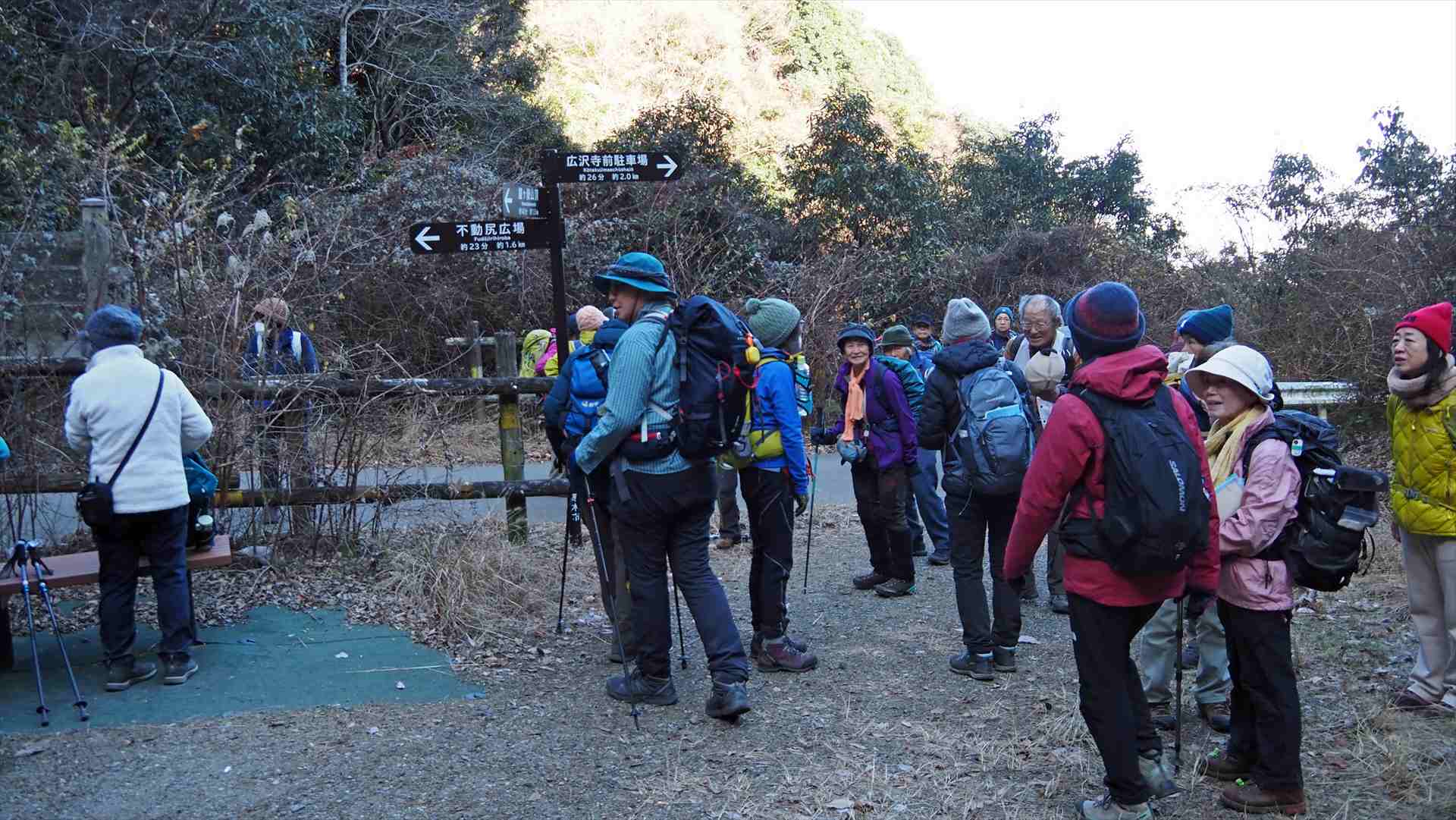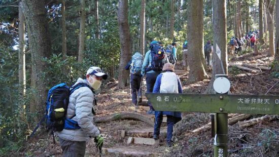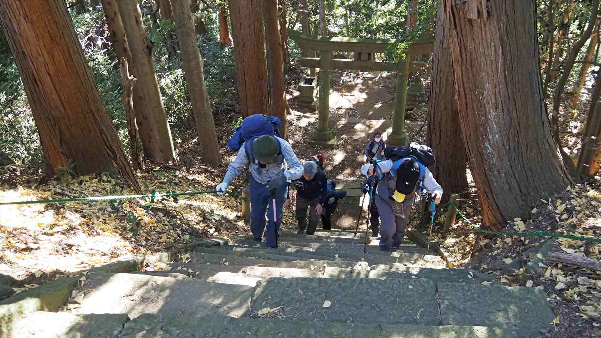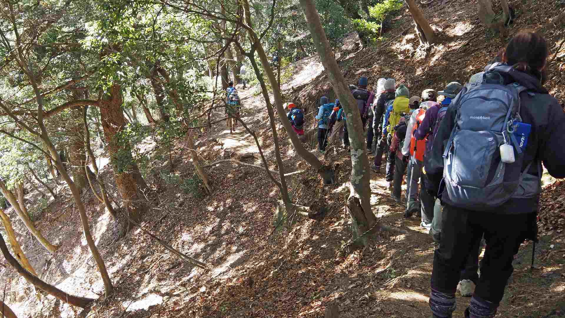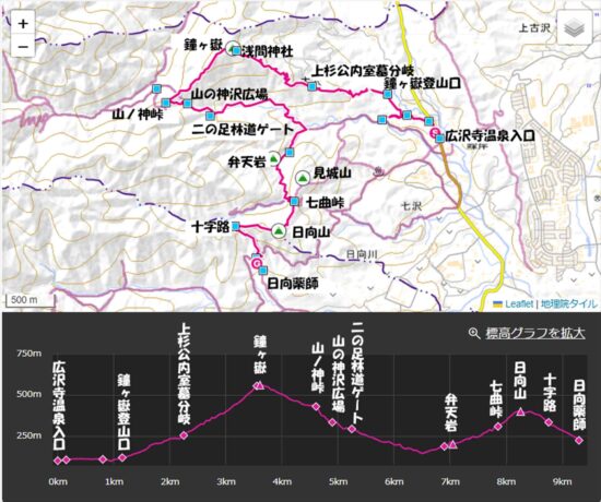 小田急線本厚木駅バスセンター=広沢寺温泉入口バス停10:22→鐘ヶ嶽登山口10:39→浅間神社12:00→鐘ヶ嶽12:04→12:10鐘ヶ嶽下広場(昼食)12:45→山ノ神峠13:15→弁天岩14:05→七曲峠14:16→日向山14:45→日向薬師15:22(解散)→日向薬師バス停=小田急伊勢原駅