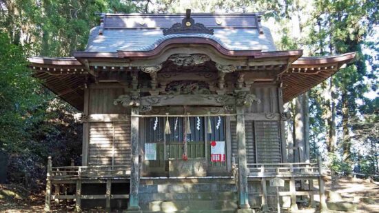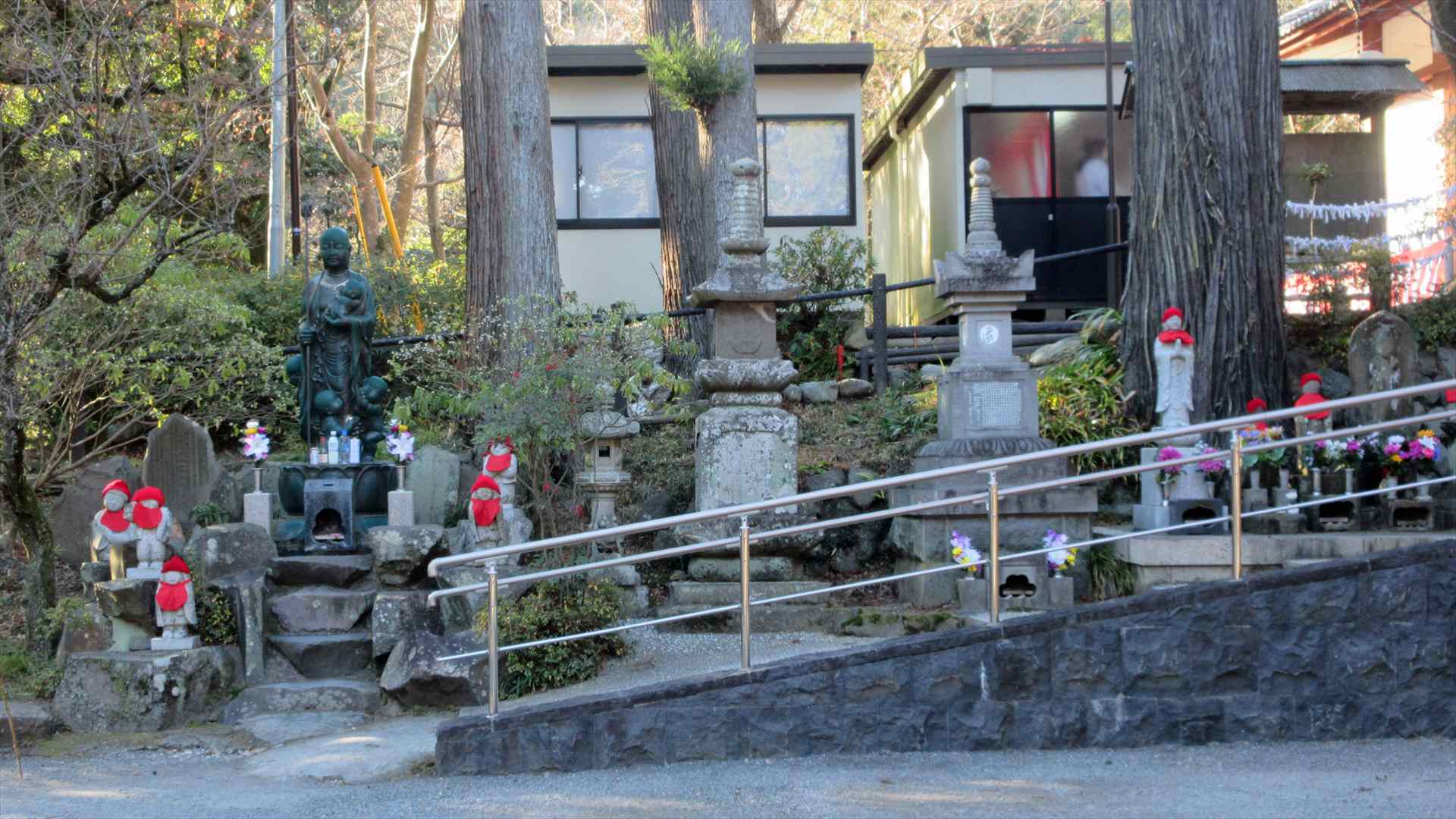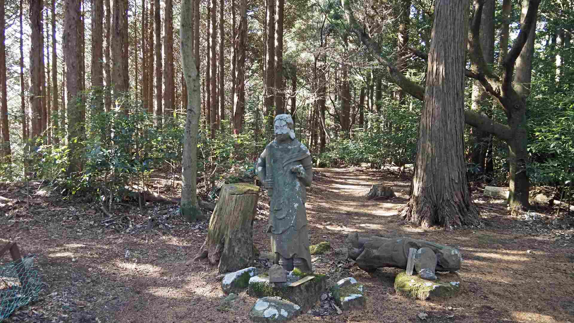 直ぐ裏にスギの木立の中 石像が佇む所が鐘ヶ嶽の頂上になります。