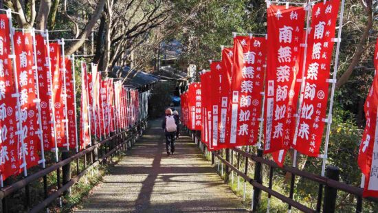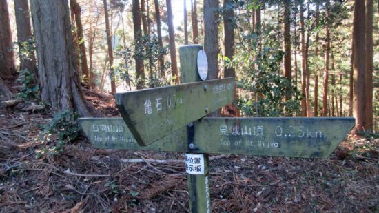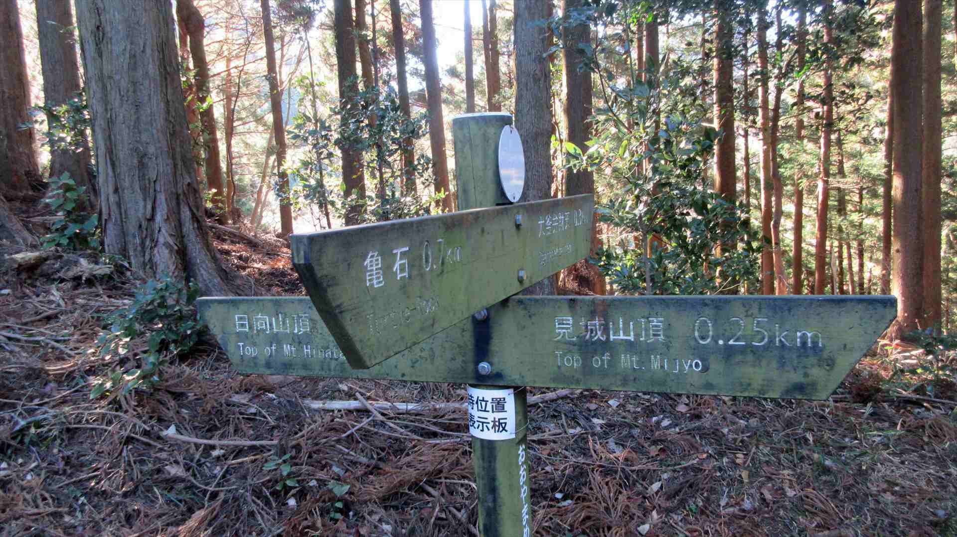 林道を1時間ほど歩き七曲峠の入口に ジグザグと登り見城との分岐からさらに登ると日向山のピークに着く。40分程 降ると日向薬師です。