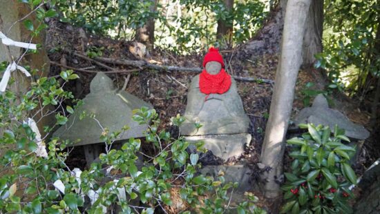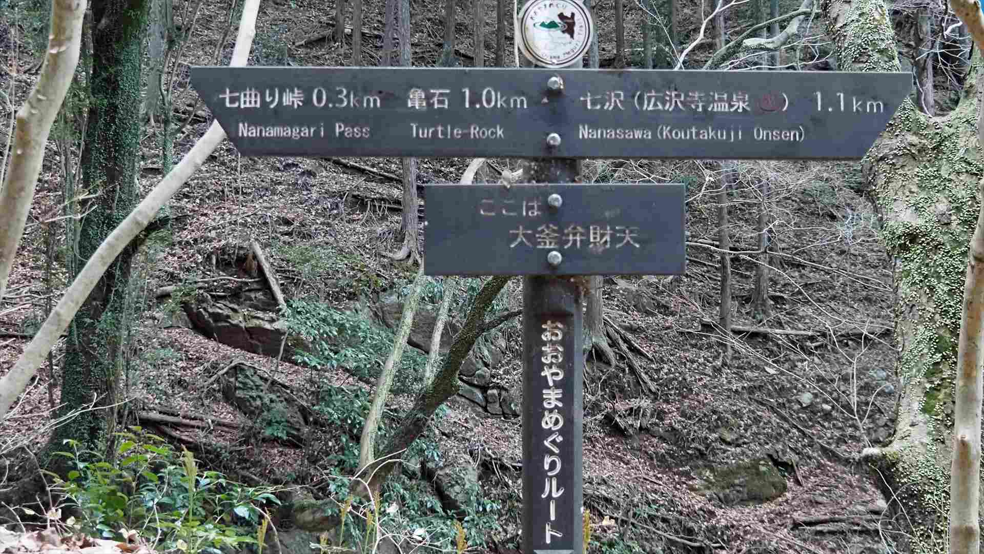 川の流れの滝壺となっている所が釜底に似ています。このことから、大きな釜のある部分という意味で「大釜」と呼ばれるようになったようです。大釜弁財天には、人頭蛇身の石碑が置かれています。七沢では、巳(蛇)は弁財天の「使い」と考えられ、いつの頃からかこの巳と弁財天が重なり、人頭蛇身の石碑となったようです。