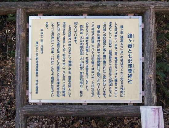 しばらくすると、釣鐘型のどっしりとした鐘ヶ嶽が見えます。 地元の人々は、「山の神」として深い信仰を寄せている。旧跡にその名残を残している。山頂には、浅間神社があります。