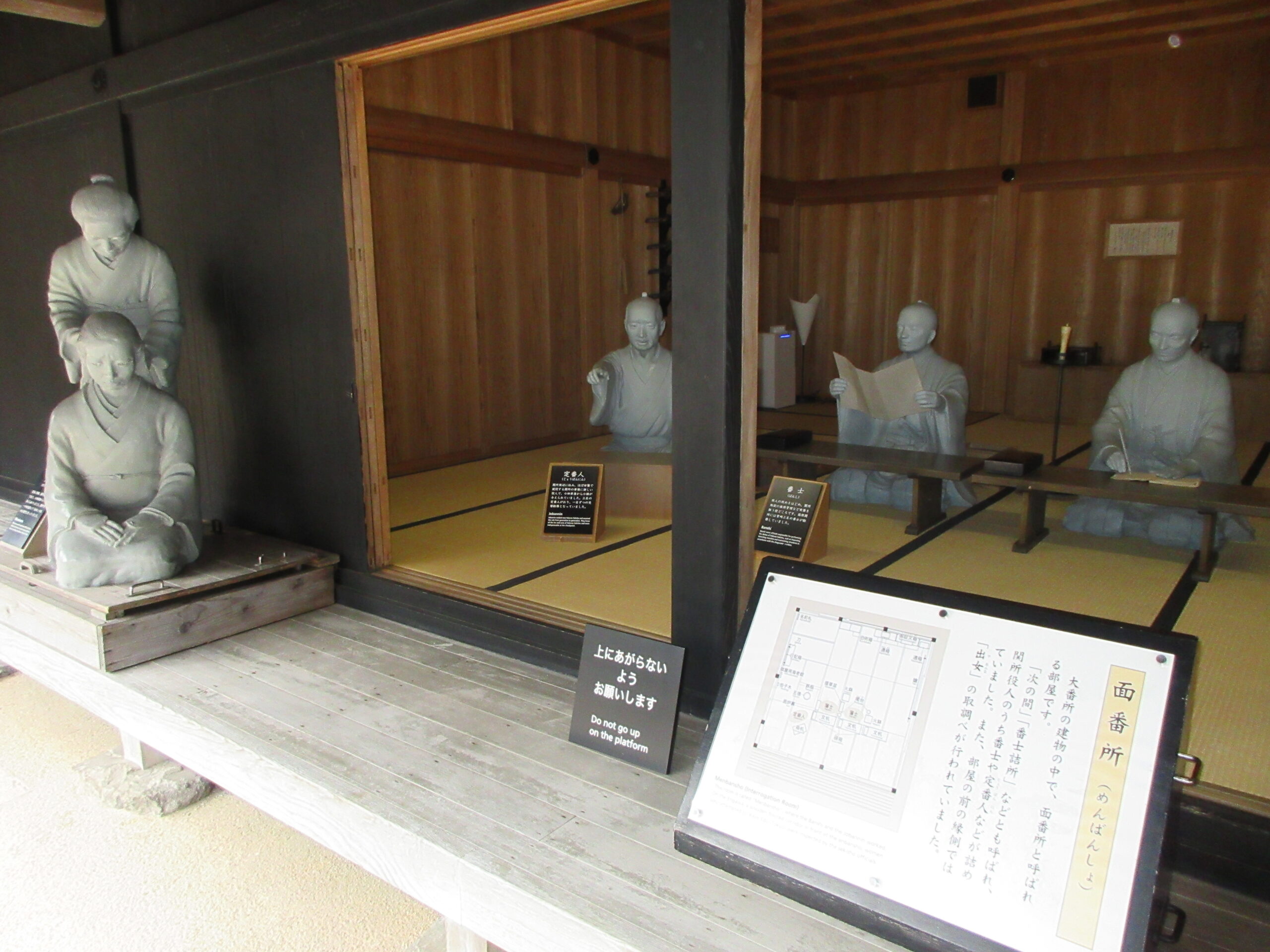 大番所(面番所) 関所役人が旅人の関所改めをした場所。左側は「出女」を調べている。