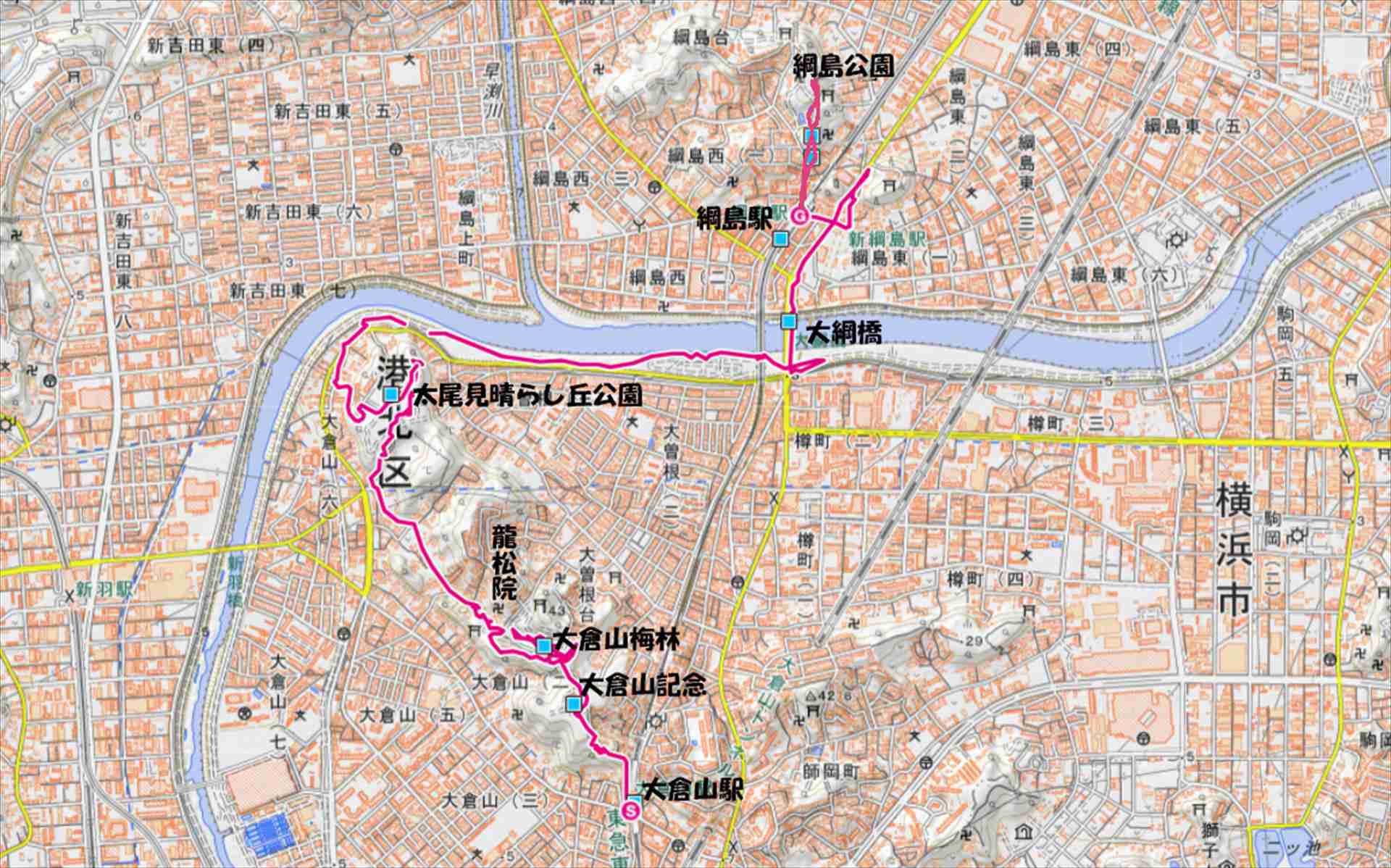 東急東横線大倉山駅10:00→10:16大倉山記念館10:31→11:04龍松院11:07→11:30太尾見晴らしの公園(昼食)12:20→大綱橋13:06→綱島公園13:50(解散)→13:55綱島駅
