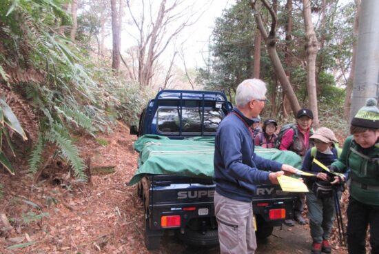 中から男性が降りてきて、どこに行くのかを尋ねられたので、これからのルートの話をすると「大丸山のリーフレット」を全員にいただけました