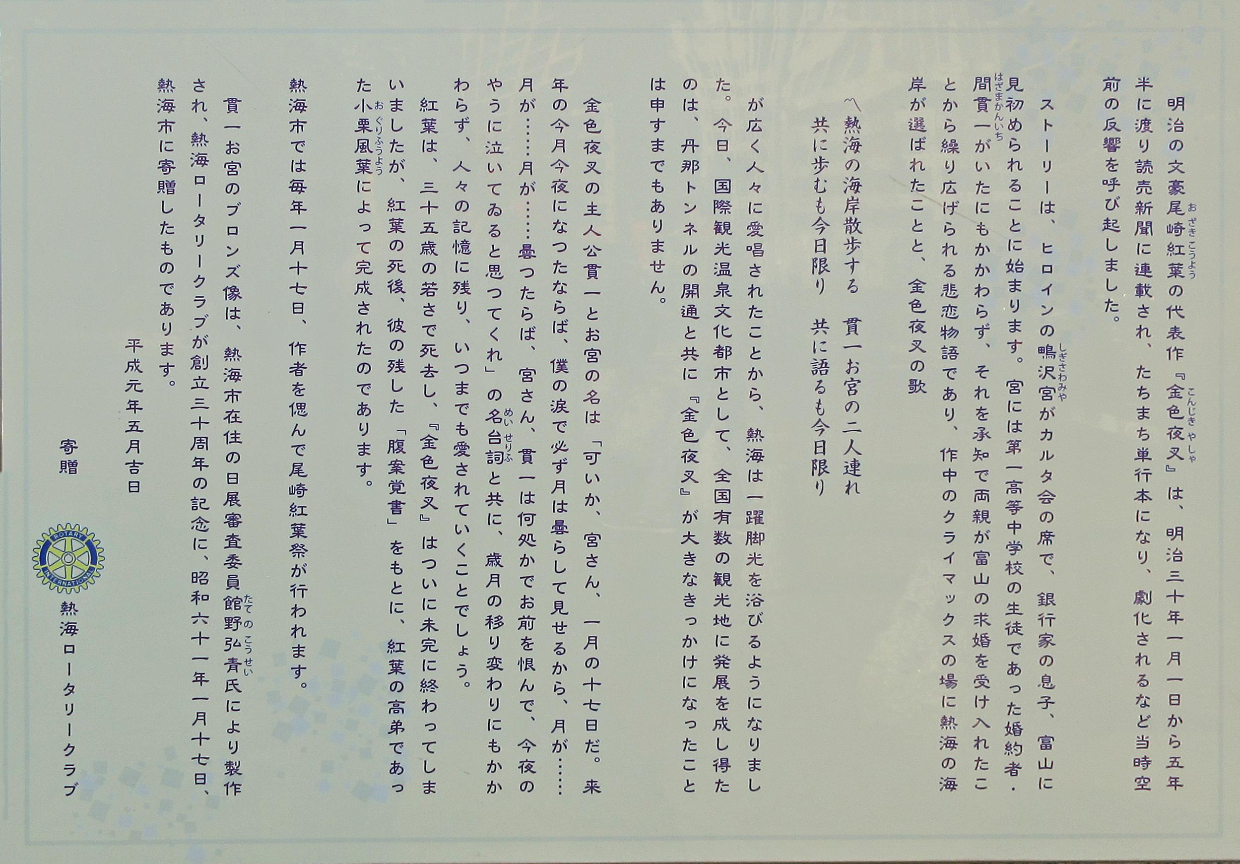 「熱海の海岸 散歩する 寛一お宮の二人連れ 共に歩むも今夜限り 共に語るも今夜限り」と悲哀物語