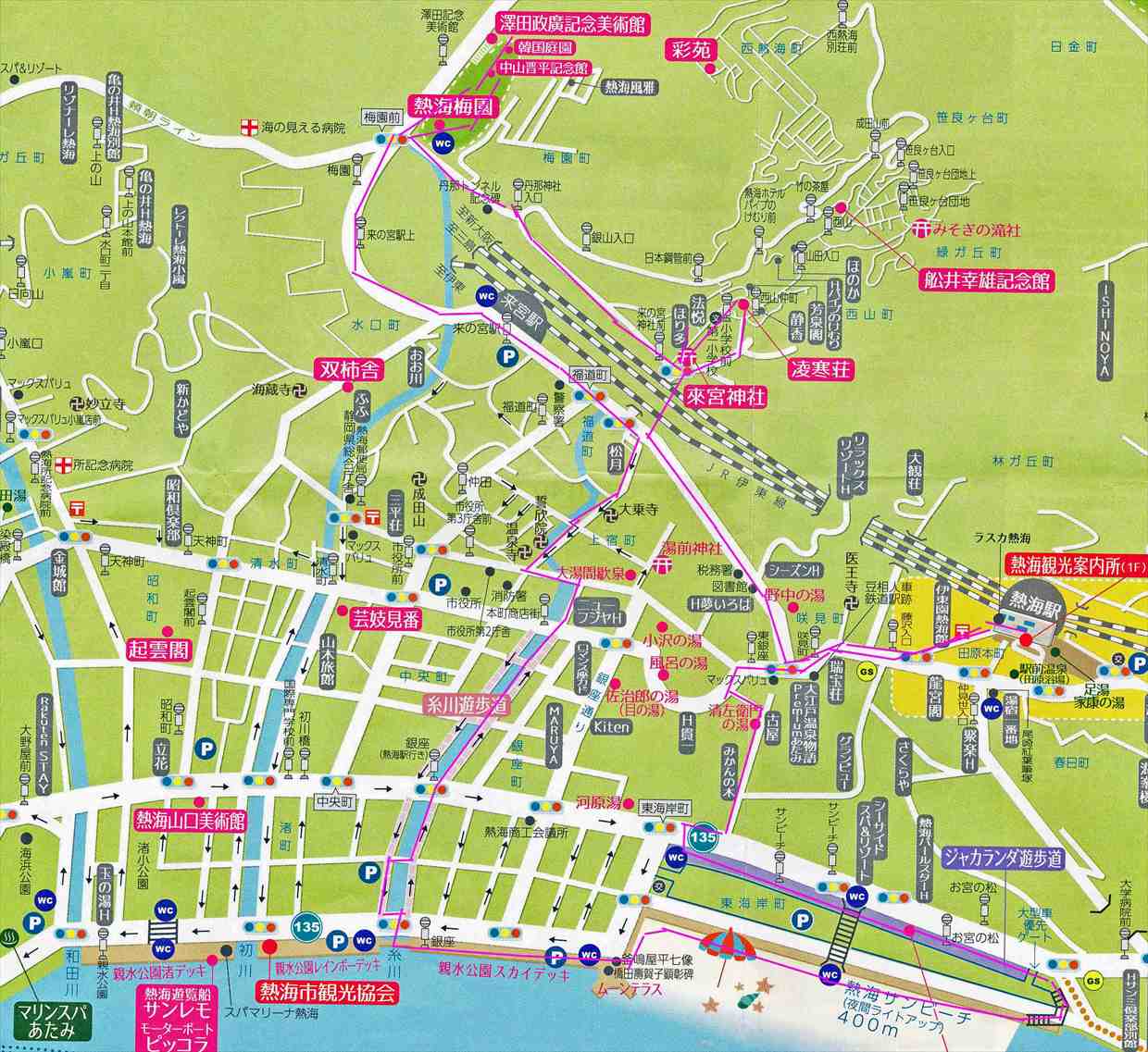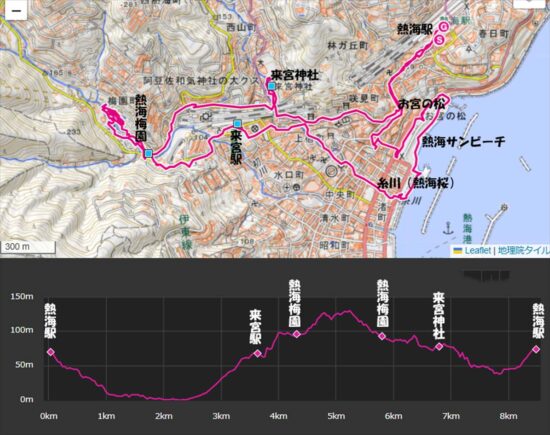JR熱海駅10:03→10:25お宮の松→10:49糸川の熱海桜→11:22熱海梅園(昼食)12:23→12:40来宮神社12:50(解散)→13:13熱海駅