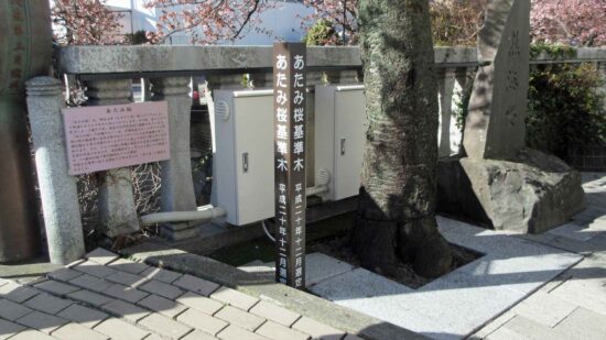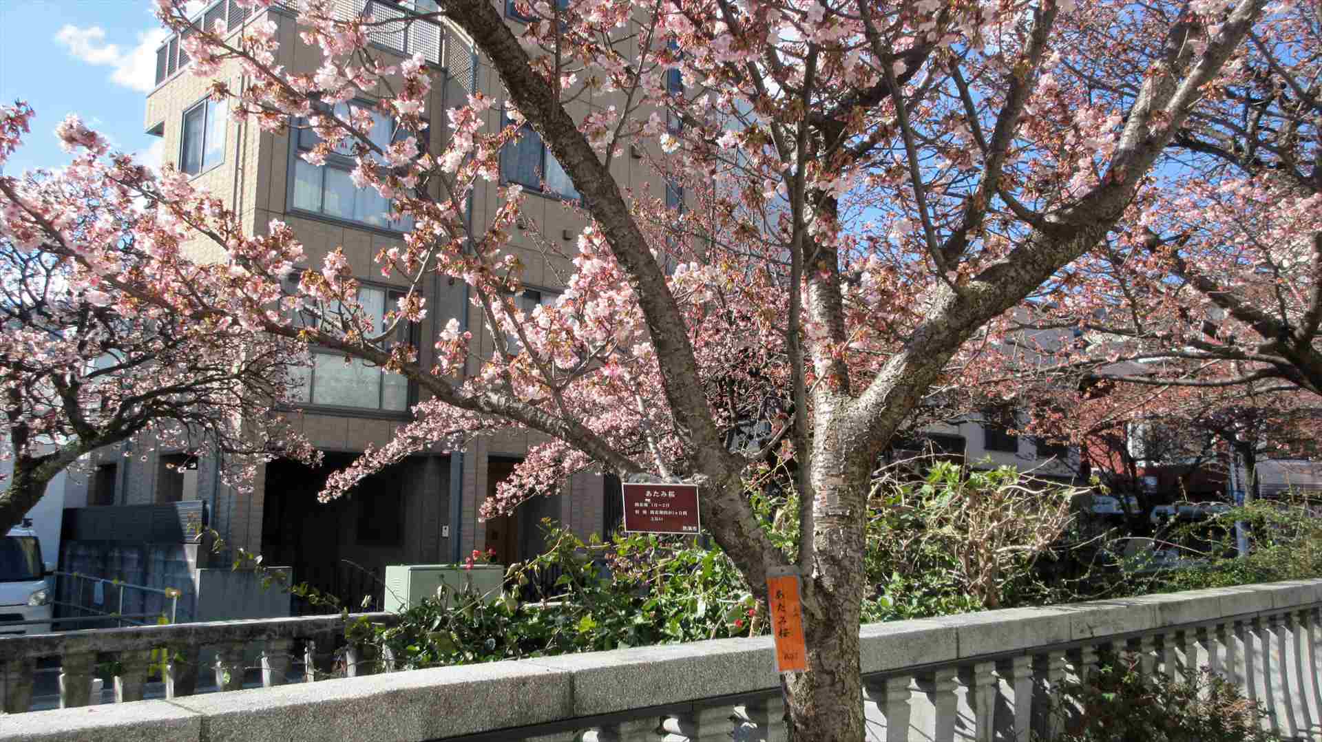 あたみ桜は、明治4年(1871年)頃 イタリア人によって熱海にもたらされたと伝えられています。その後、先人たちの努力によって殖やされ、現在では市内各所に植栽されています。「あたみ桜」の品種のルーツは、沖縄原産のカンヒザクラと関西以西の暖地帯に自然分布するヤマザクラと自然雑種であり、開花期は1月で沖縄のカンヒザクラと並んで日本で最も早く花が咲きます。また、ひとつの枝に早期開花する花芽と後期に咲く花芽が形成されるため、開花期間が1ケ月以上と長いのが特徴です。(一般的な桜の開花期間は、1~2週間) 市制40周年にあたる昭和52年4月には、「市の木」に制定されました。説明板より