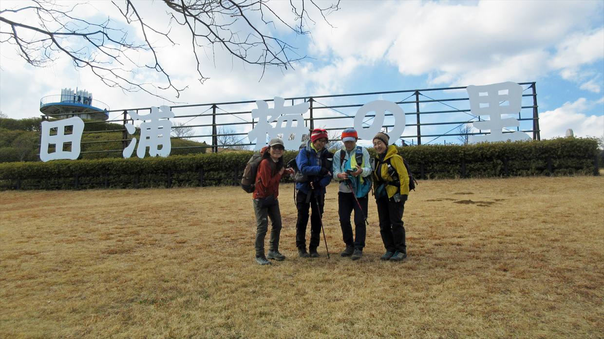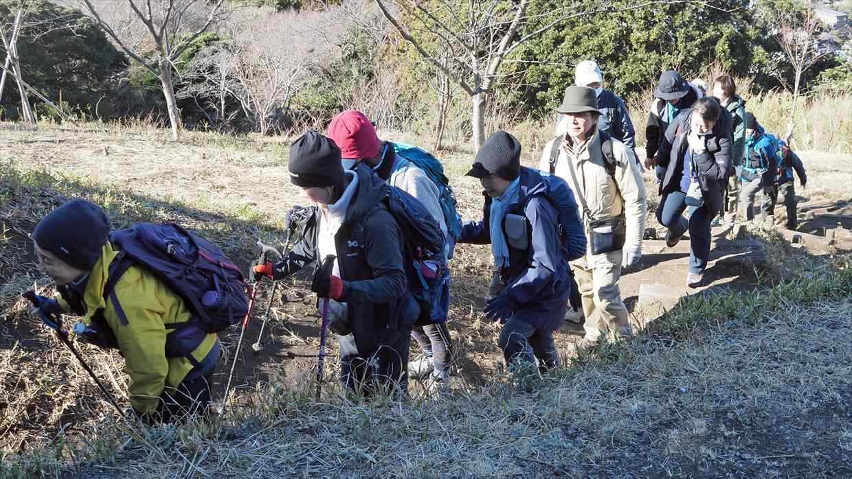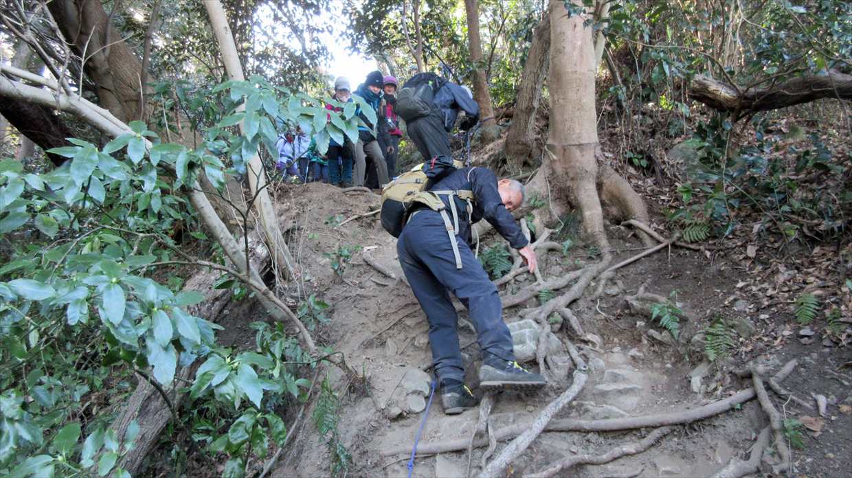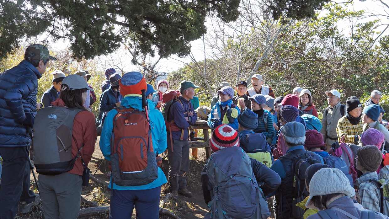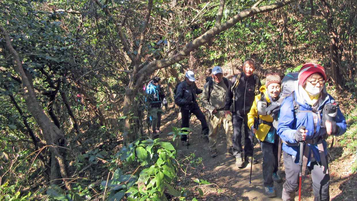 この時期三浦半島は暖かく、標高は低いが幾つもの小さなピークがあり、 冬場の脚の訓練場として人気なスポットです。参加人数が多数のため3班にわけて歩行。バスを降り少し登ると仙元山、 江ノ島のバックには雄大な富士山が望む絶景です。