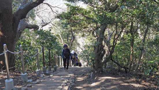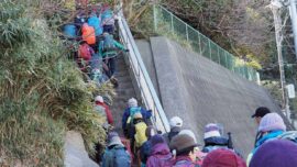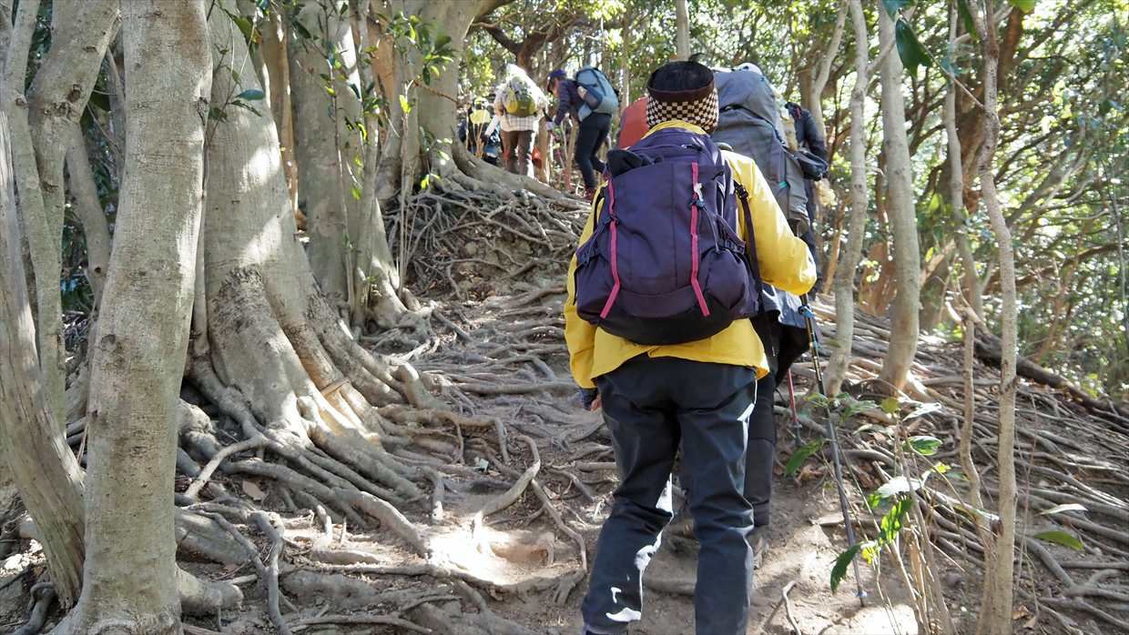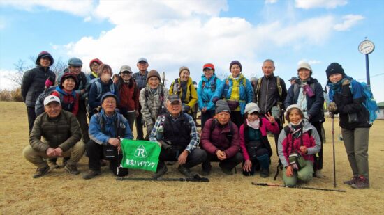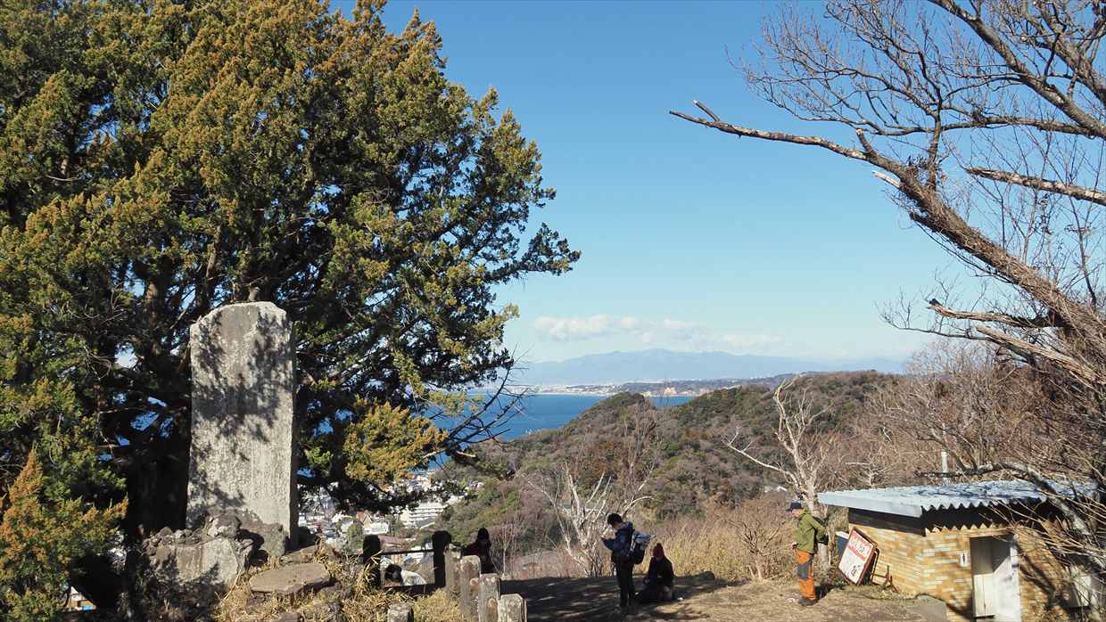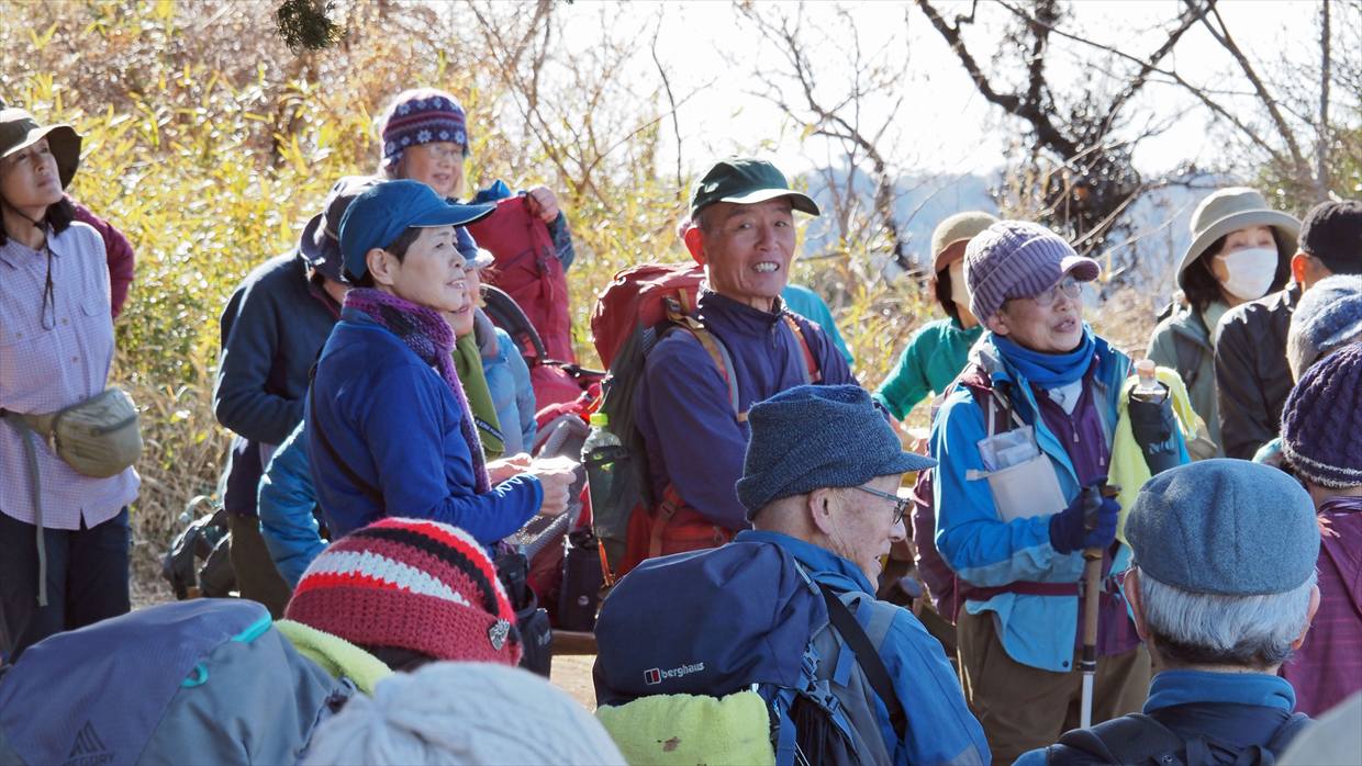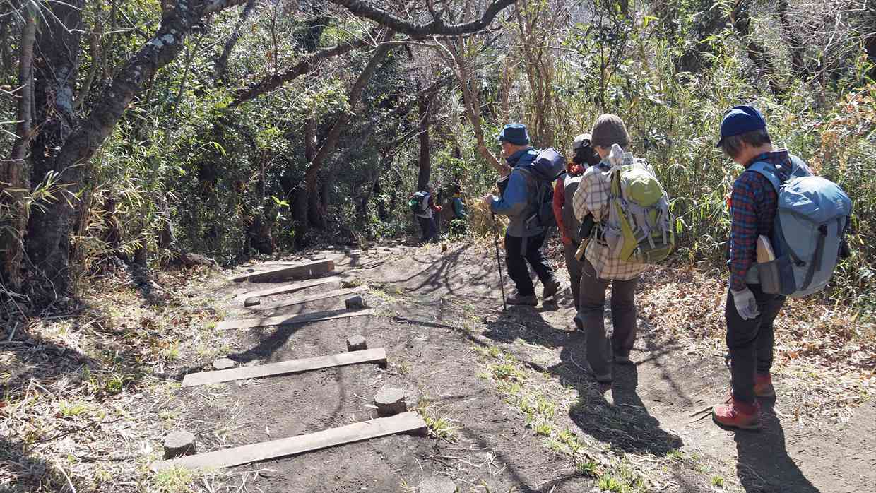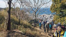 この時期三浦半島は暖かく、標高は低いが幾つもの小さなピークがあり、 冬場の脚の訓練場として人気なスポットです。参加人数が多数のため3班にわけて歩行。バスを降り少し登ると仙元山、 江ノ島のバックには雄大な富士山が望む絶景です。