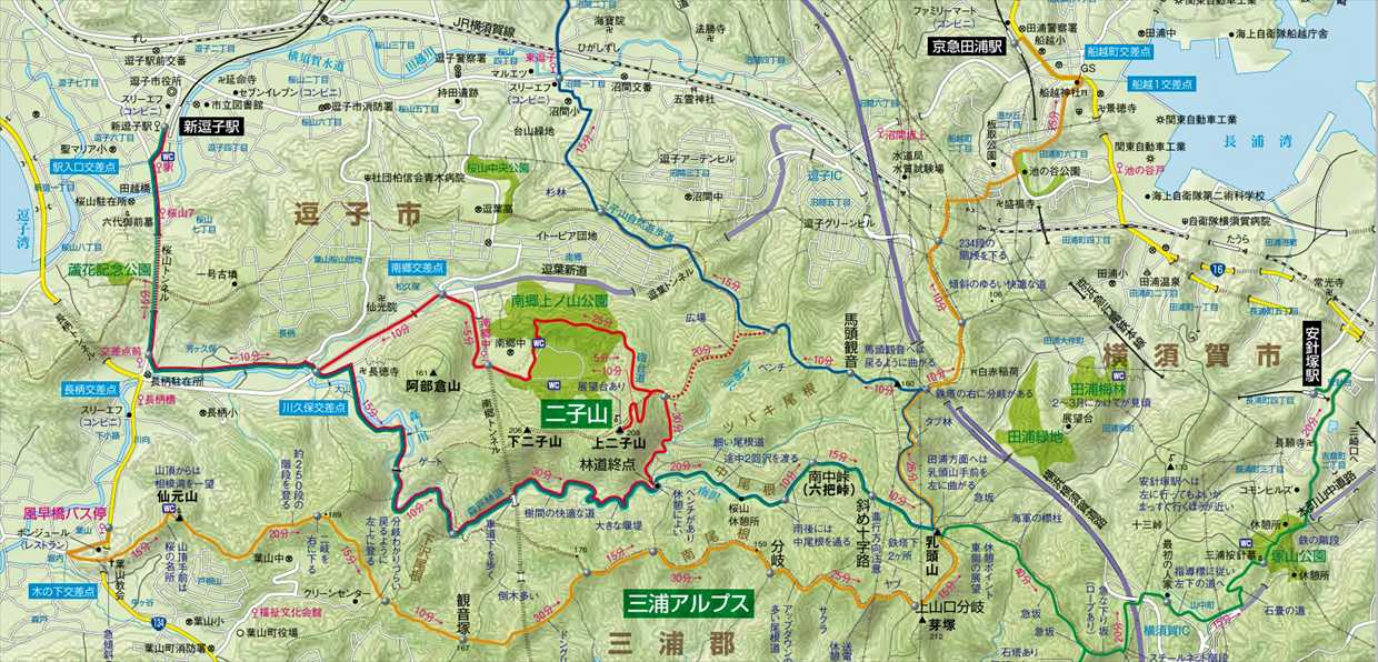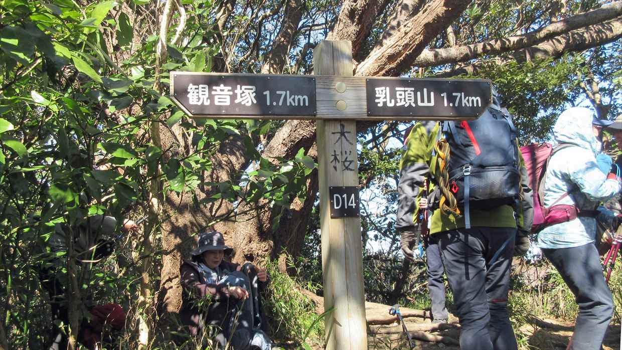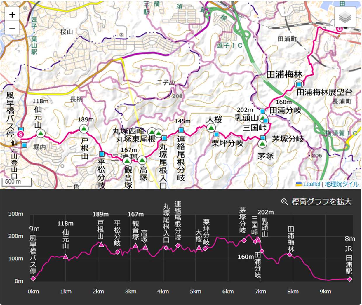 JR横須賀線逗子駅=風早橋バス停9:18→9:29仙元山9:44→10:46観音塚→南尾根→鉄塔下(昼食)→13:19乳頭山13:32→14:09田浦梅林14:30→15:13JR田浦駅