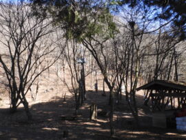 鐘掛城より目の前の山容 あずまやとトイレのある石間峠(イサマトウゲ)