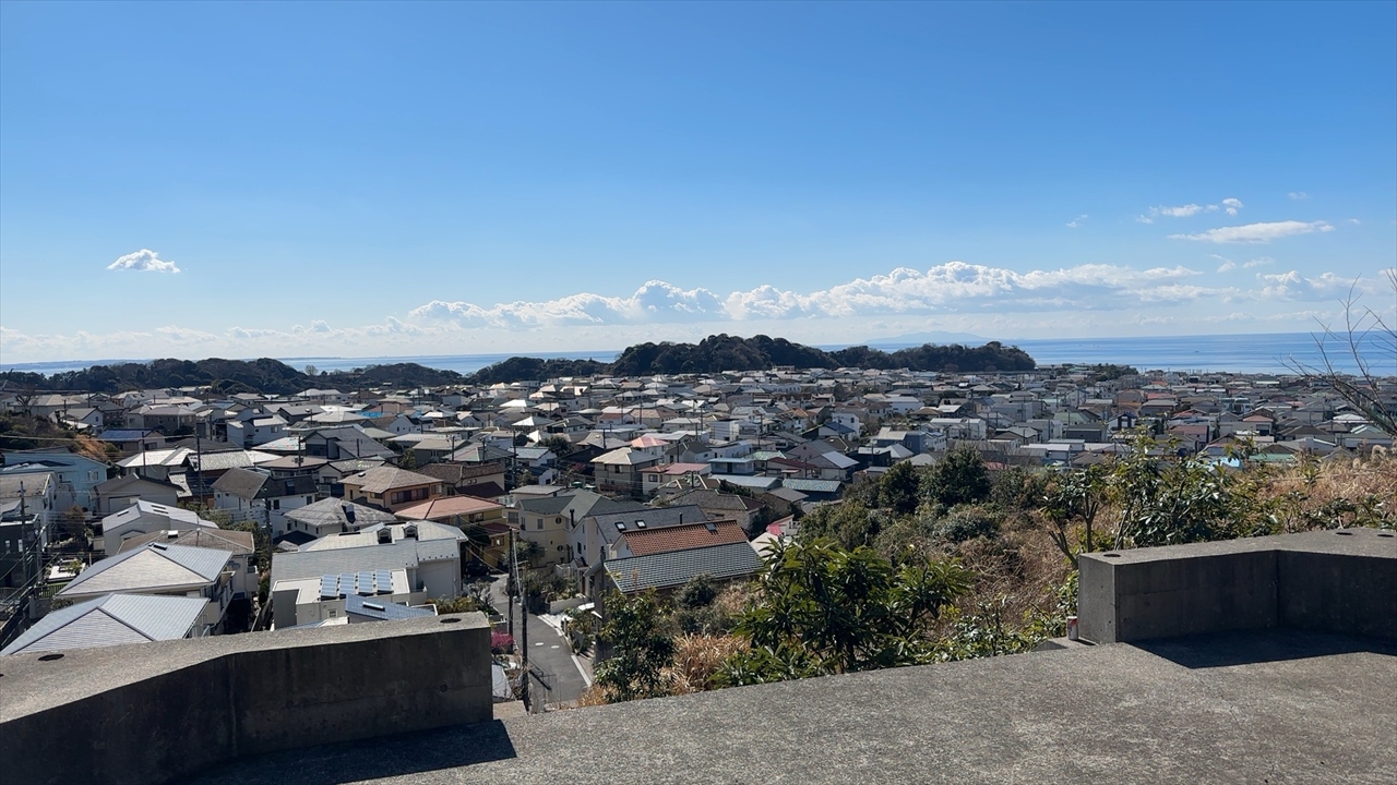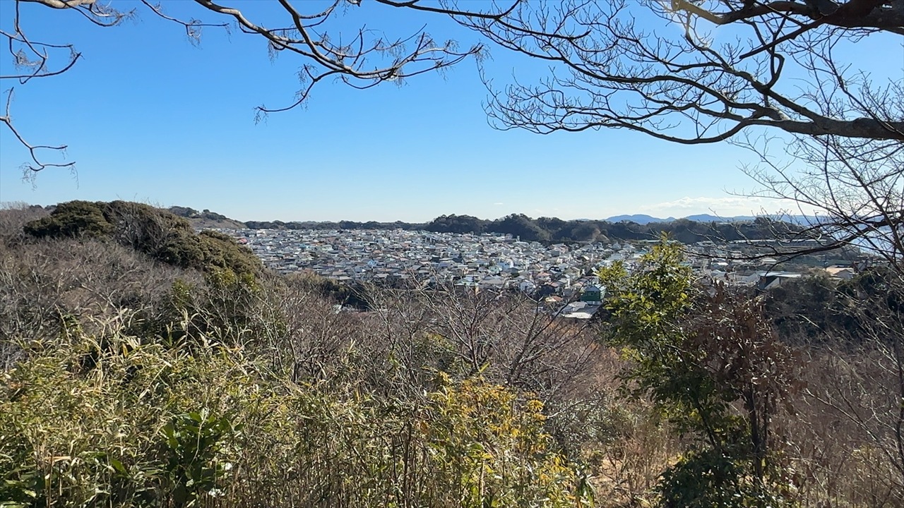 遊歩道の展望台から鎌倉の市街地を望む。右上に相模湾が望めます。