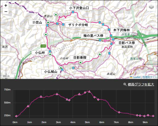 ▼コース : 日影バス停 08:55 – 10:06日影乗鞍 – 10:35 城山 – 11:07 小仏峠 – 11:45 景信山(昼食) 12:20 – 12:51 ザリクボ分岐 – 13:45 小下沢登山口 14:34 – 14:11 こげざわの森・二番口 – 14:20 木下沢梅林 – 梅の里入口バス停