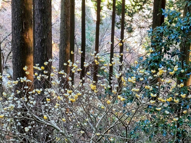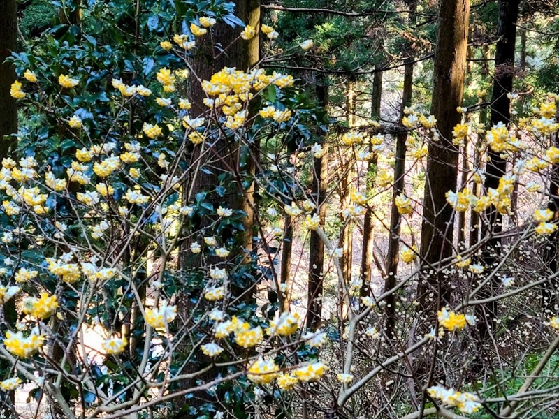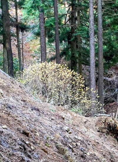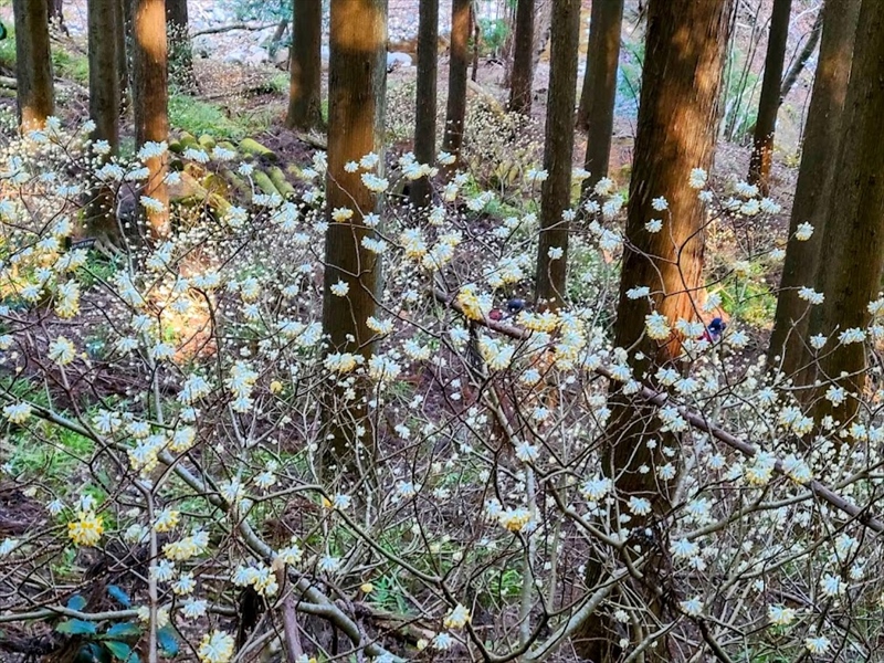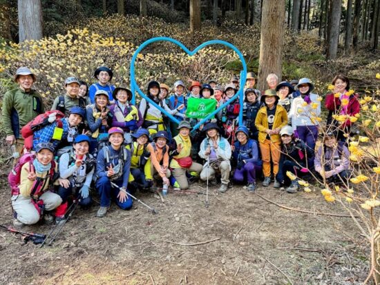 不動尻のミツマタ群生地にて、集合写真。このところの寒さの影響で開花が少し遅れているようでしたが、それでも、ミツマタの群生を楽しむことができました。