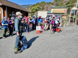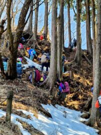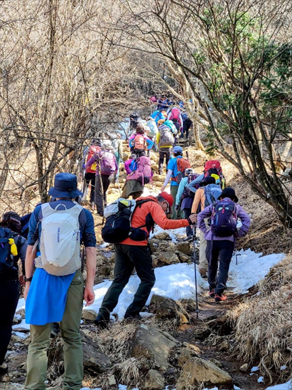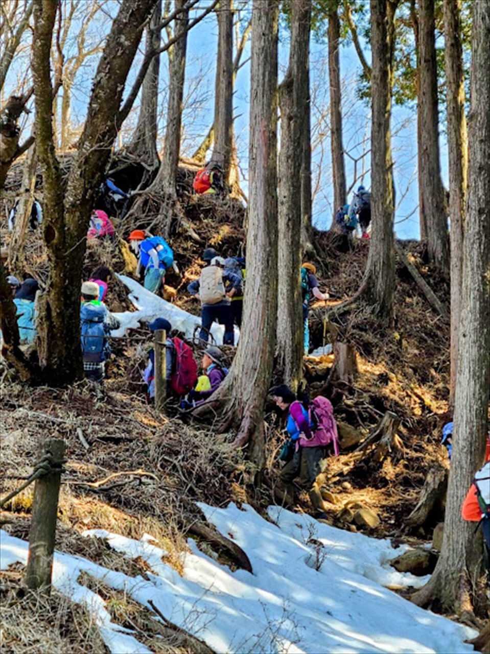 数日前に降雪があり、大山登山の方の報告から軽アイゼンが必要、体力もかなり必要、との判断から、ヤビツ峠までバスで行き、最後の鐘ヶ嶽も登らずに広沢寺温泉入口まで下るというコースも希望により選択することができるようにしました。29人の方が蓑毛バス停から歩き始め、ヤビツ峠で、10人の方と合流し大山山頂に向かいました。昼食休憩後の唐沢峠までの下りが積雪の影響がある、と心配でしたが、かなり気温が上昇したことによりアイゼンを装着しなくても安全に歩くことができ安心しました。不動尻ではミツマタの群生も楽しむことができ、その後、ご希望により、鐘ヶ嶽に向かうグループ15人と登らずに下山するグループ24人に分かれて行動しました。今回も、参加リーダー、協力者、参加者の皆さんの御協力のおかげで、無事に山行を終えることができました。ありがとうございました。 木村博子