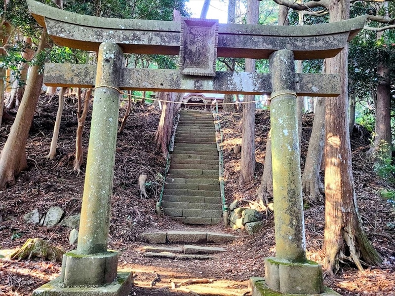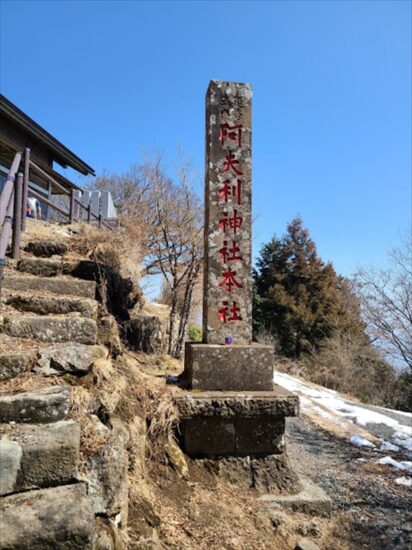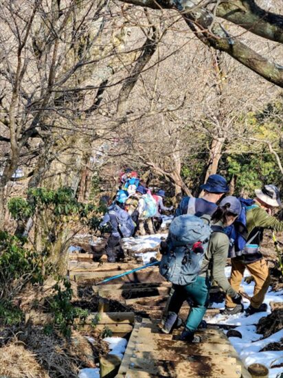大山から唐沢峠までの路。急な木の階段が続きます。階段上に雪が残っていなかったので、アイゼンを装着しないでも通過できました。