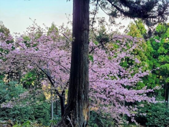 暗い境内にひときわ目を惹く樹木。一瞬で目の前が明るくなりました。まさしく、春の色でした。