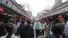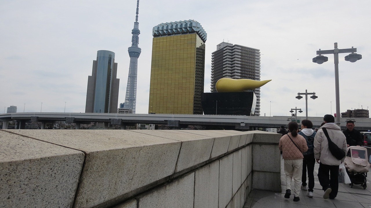 東武浅草駅周辺。午前の早くから人出は多かった。 吾妻橋から対岸の名物ビルを眺めて