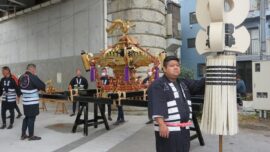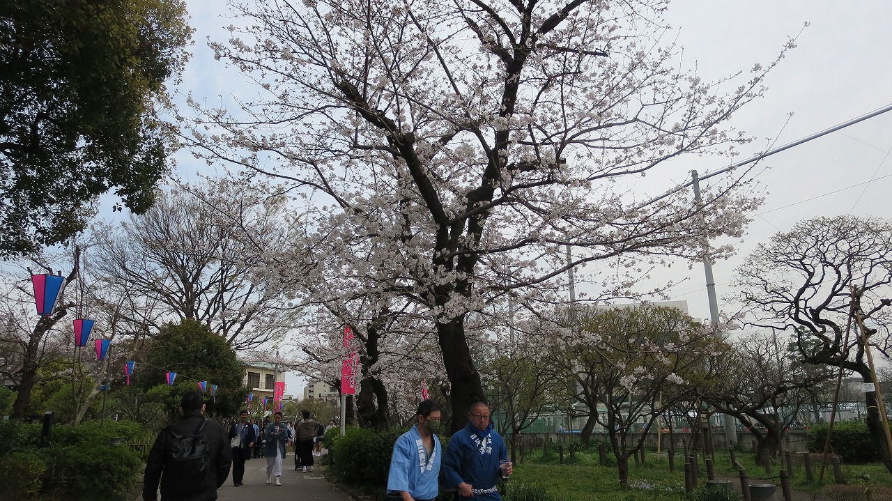 さくら祭りの提灯と祭り会場に向かう法被姿の男と桜は似合う ?