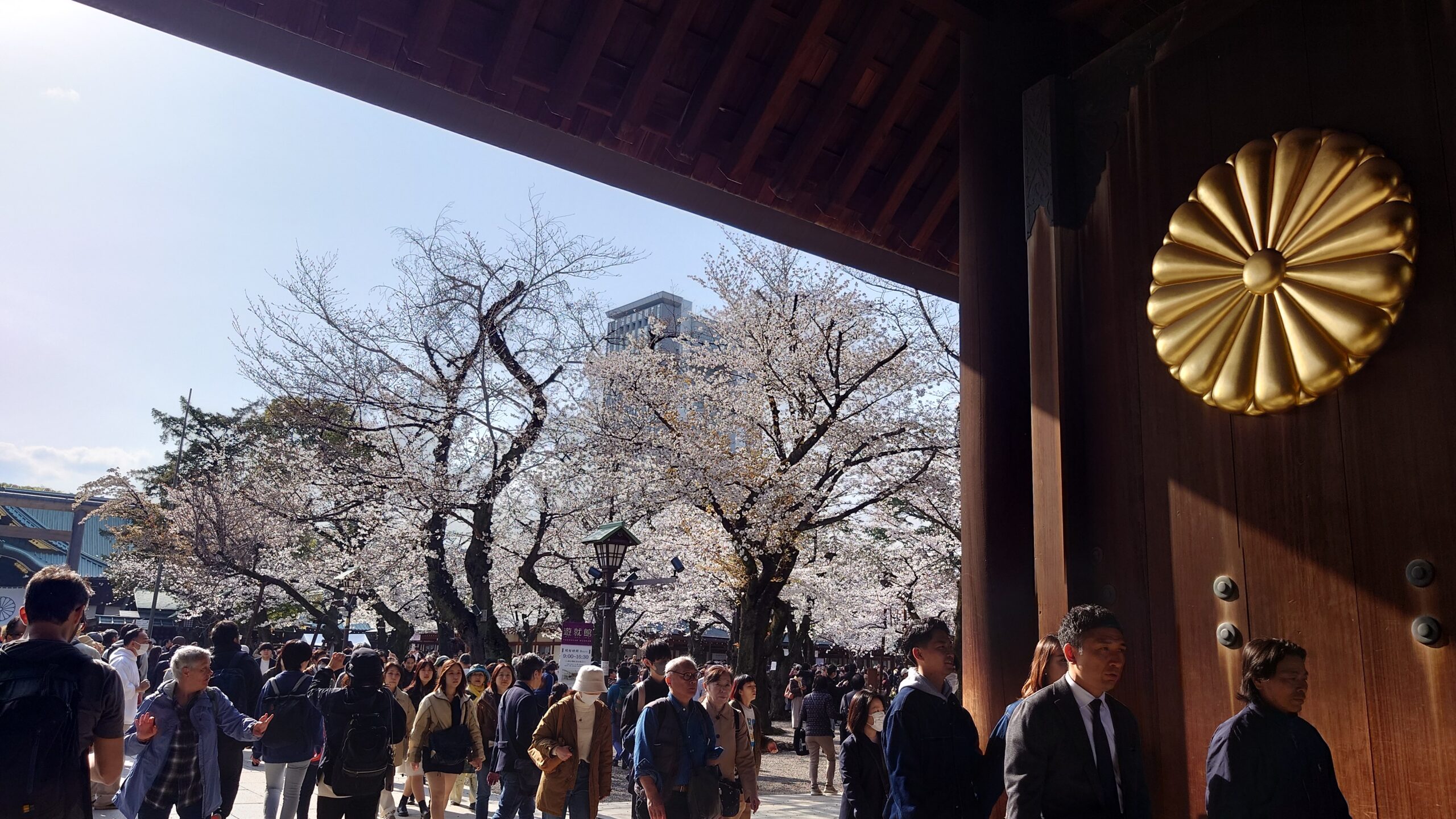 靖國神社の正門にあたる神門は、昭和9年に完成しました。 お参りした人々の多くがこちらで記念撮影をします。 高さ6メートルの扉に取り付けられた菊の御紋章は、直径1.5メートルあります。 菊の花弁は、太陽の放射線を表わすデザインとして、古代から海外でも用いられています….. とあります
