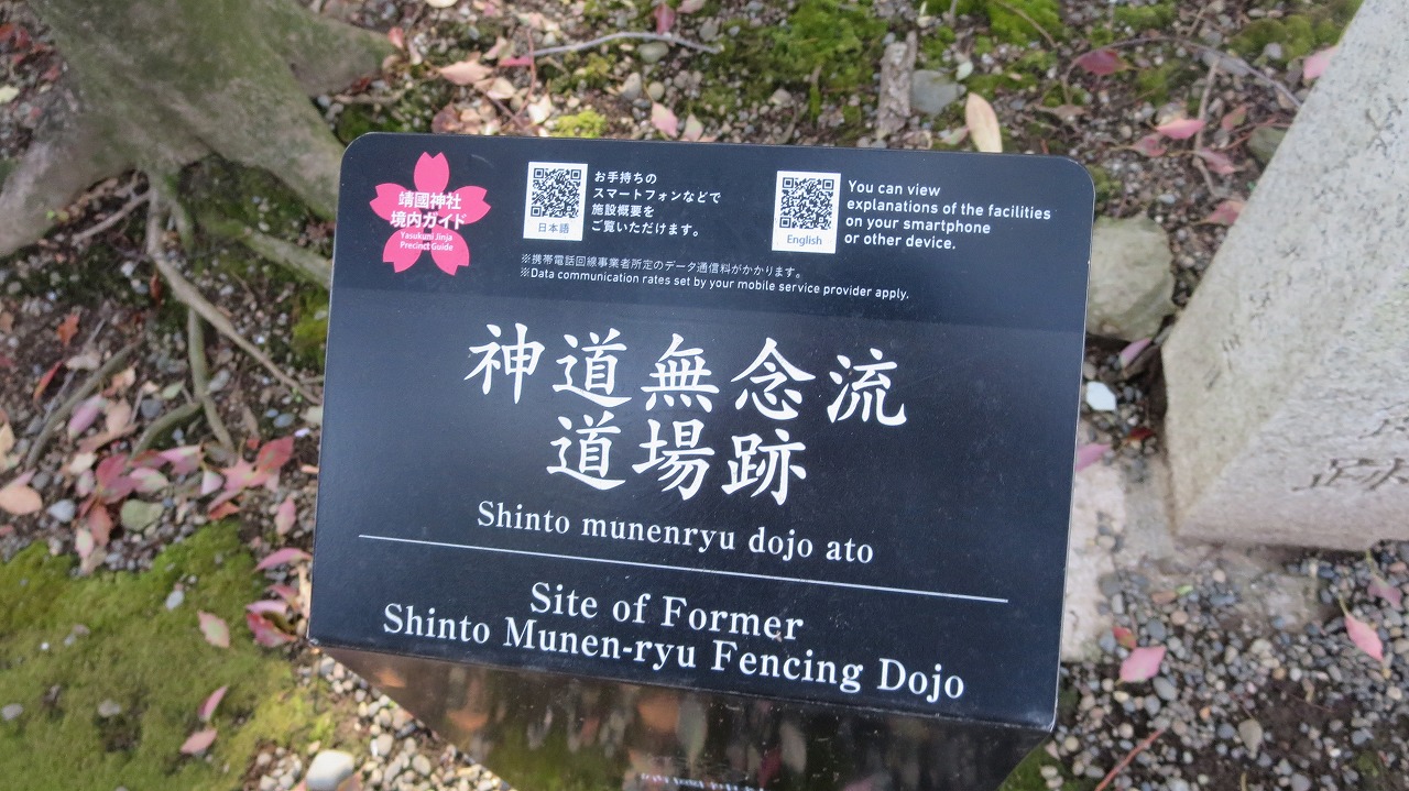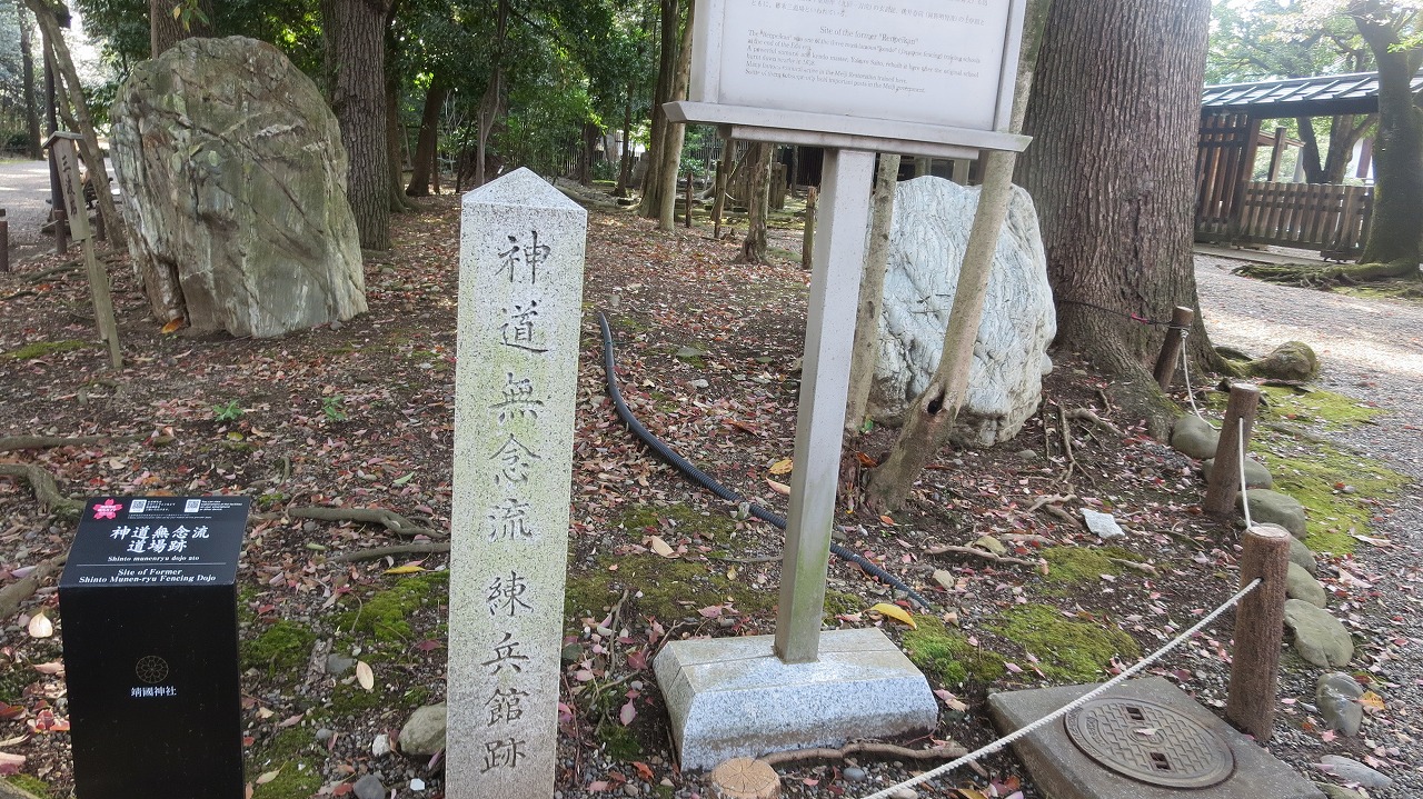 靖国神社境内の「神道無念流道場跡」 日本の剣術流派。 宝暦 年間(1751年 – 1764年)頃 福井兵右衛門嘉平 によって創始された。幕末期に新撰組から長州、水戸の志士まで幅広い志士を魅了した流派です…とあります。