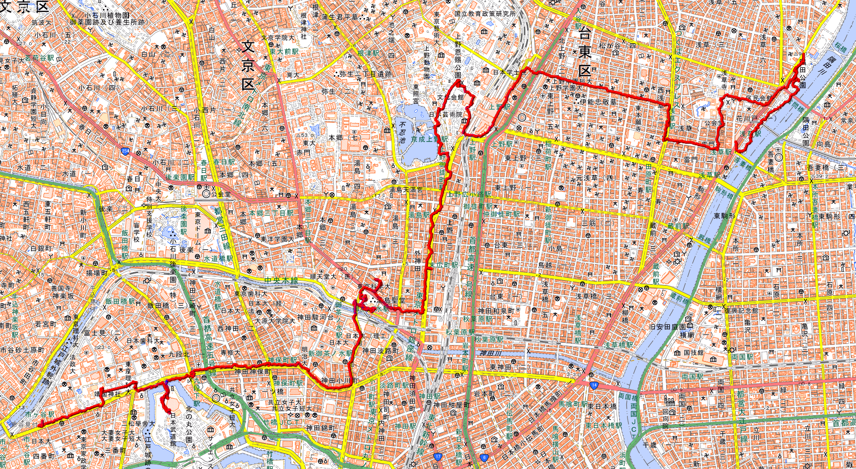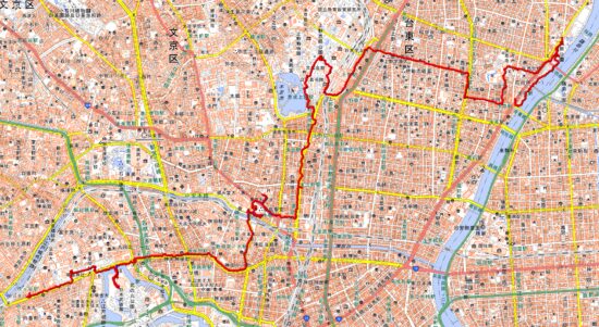 東武浅草駅9時25分→言問橋→桜橋→浅草寺→雷門→上野駅→上野公園さくら通り→不忍池→神田明神→湯島聖堂→日本武道館→靖国神社(解散)→九段下駅(市ヶ谷駅)15時30分