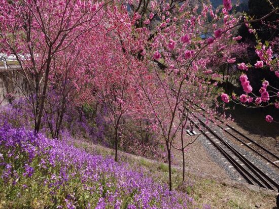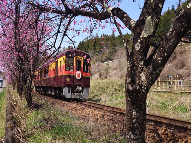 線路沿いの花桃に沿って、1両わたらせ鉄道の電車が走り抜ける