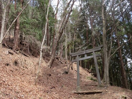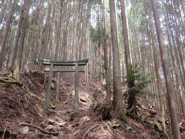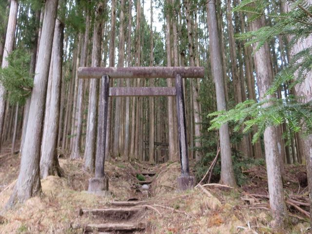 スッキリと枝落ちされた杉林の中を 入口に三連の鳥居があり、四つ目の鳥居