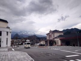 JR日光駅 遠くに雪を抱いた日光連山 「神橋」右の林内は日光山内