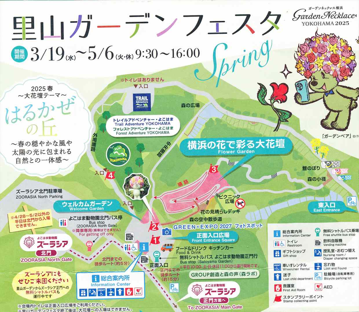 里山ガーデンは、よこはま動物園ズーラシアに隣接する横浜市内最大級、約10,000平方メートルの大花壇春と秋の期間限定で「里山ガーデンフェスタ」(ガーデンネックレス横浜のプログラム)が行われる。
