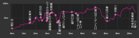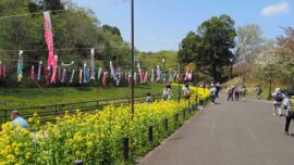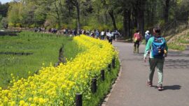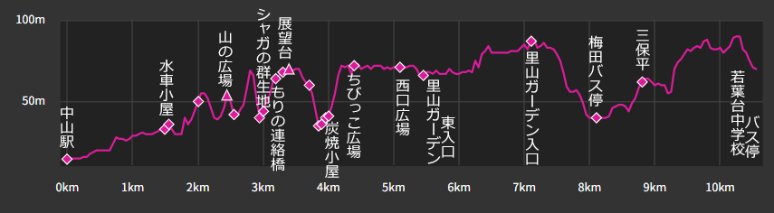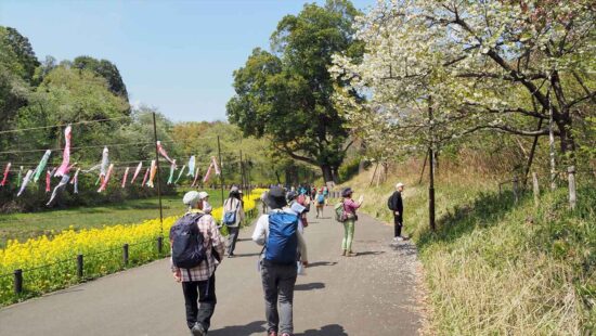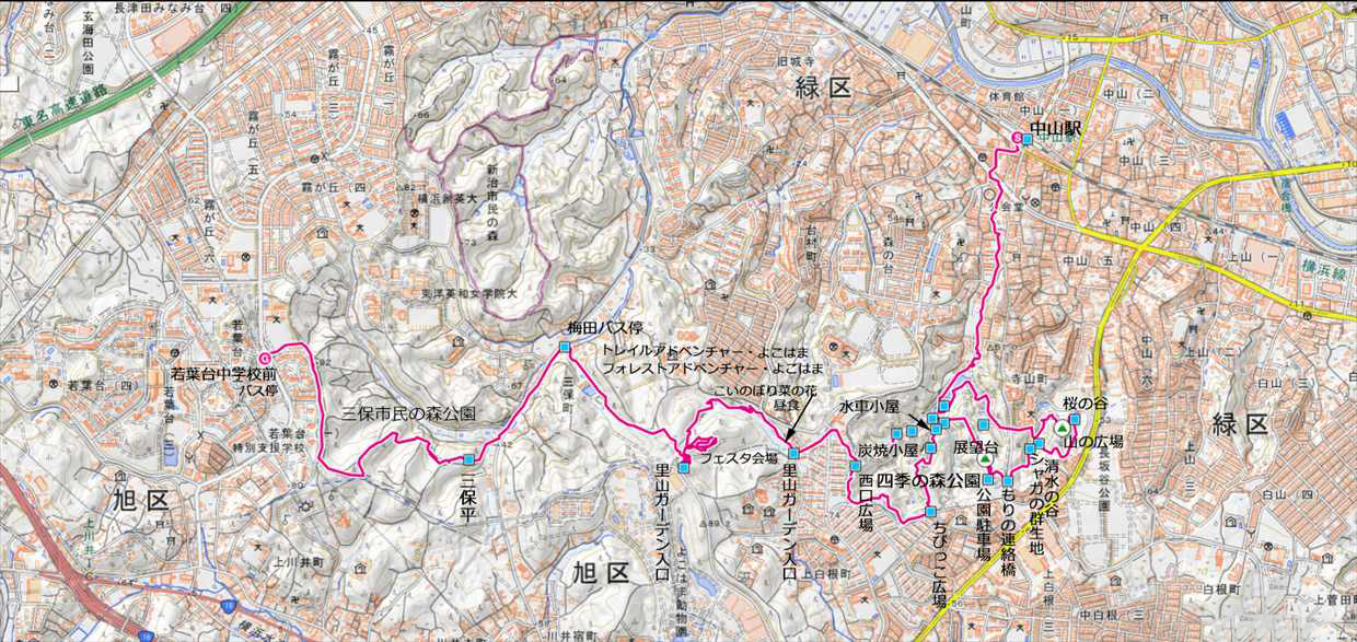 11:08→西口広場11:55→12:07鯉のぼり・菜の花前(昼食)(里山ガーデン東入口)12:42→12:50里山ガーデンフェスタ会場13:30→13:55三保市民の森→14:38若葉台中学校バス停=JR横浜線十日市場駅