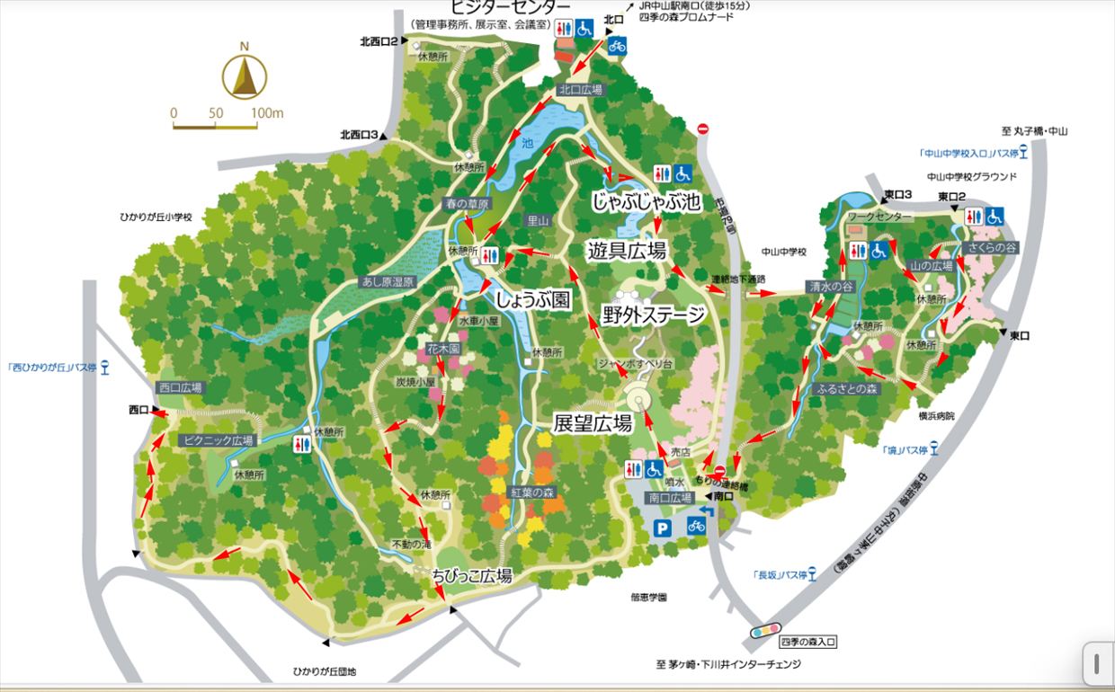四季の森公園マップ(赤い矢印は行程) 北口から入場~西口退場