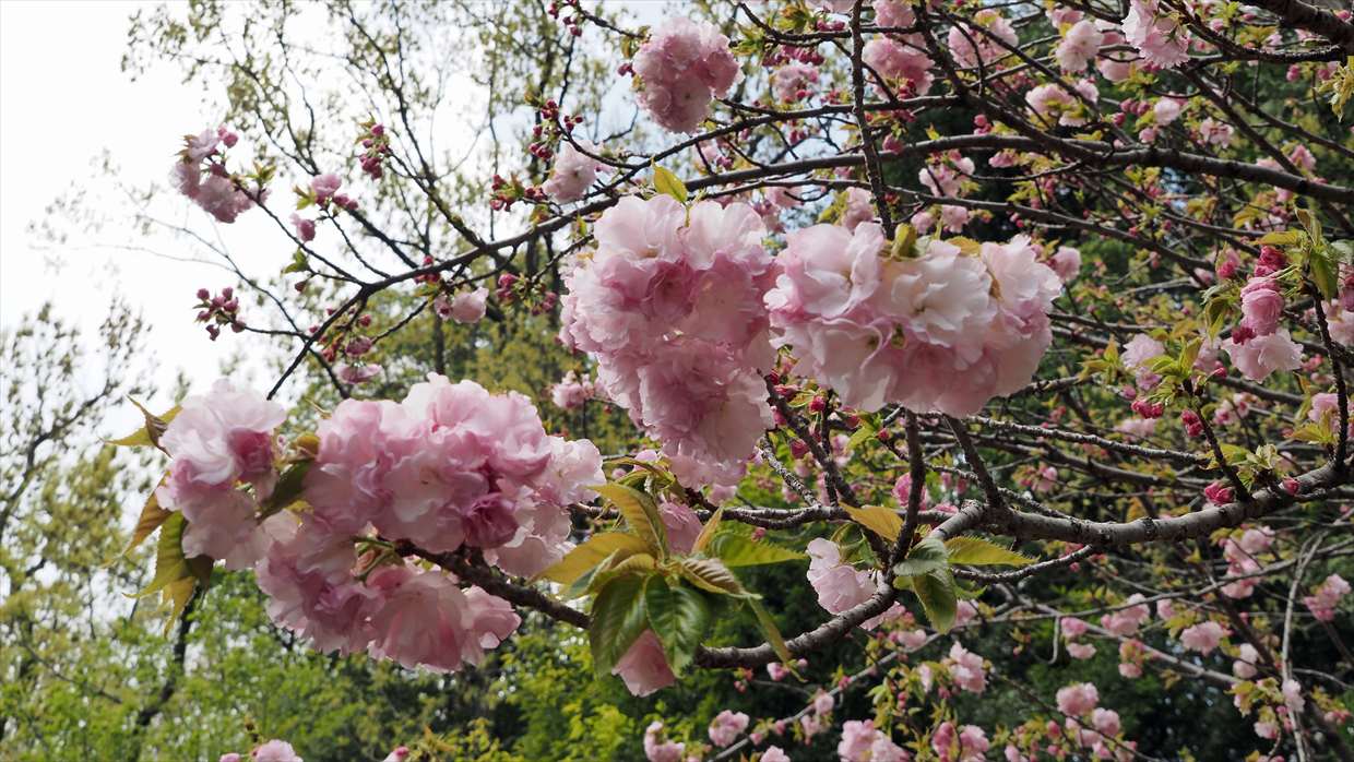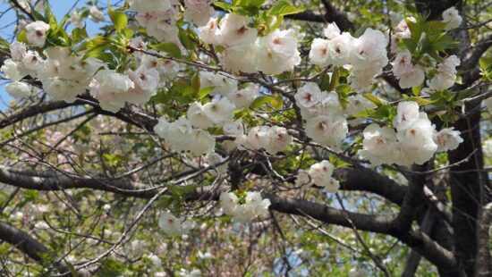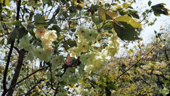 一方、同じような花色のギョイコウ「御衣黄」は、花弁に葉緑素が入っており緑色の筋があるため黄緑色に見えます。