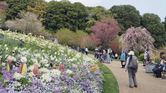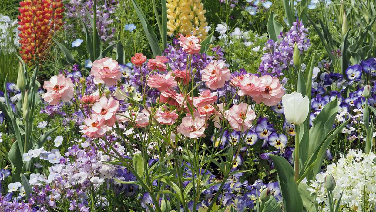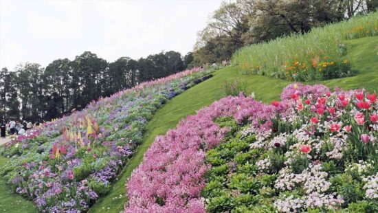 桜の花も散り 木々も芽生え始め 四季の森公園は季節の移り変わりを感じての散策でした。色とりどりの花々で里山の斜面を彩る大花壇 咲き誇る草花は素晴らしく見応えがありました。