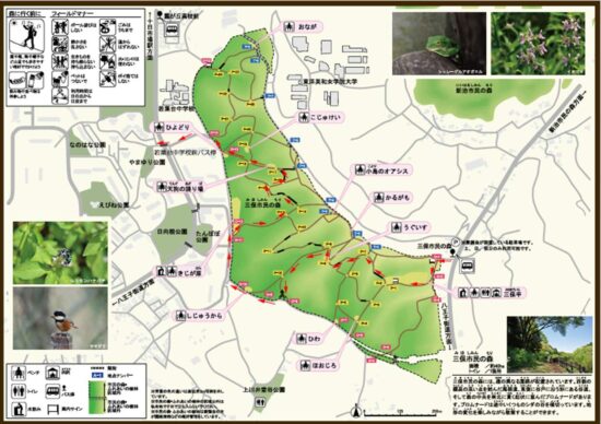 三保市民の森は、新治市民の森、横浜動物の森と近接しており、横浜市内に残る緑の拠点となっています。スギやヒノキ、シラカシの山林に谷戸が入り組み、変化に富んだ環境が特徴です。特に林床のシダ類の豊富さは、市内でも有数の場所です。