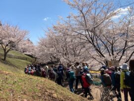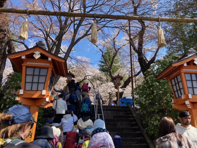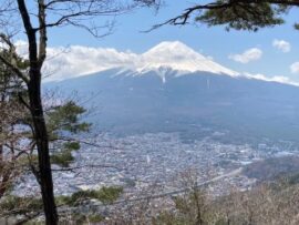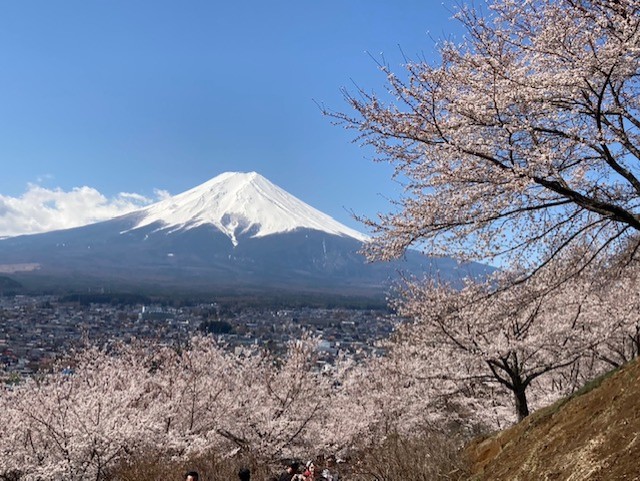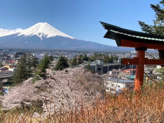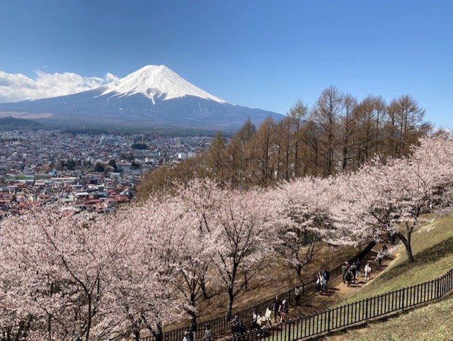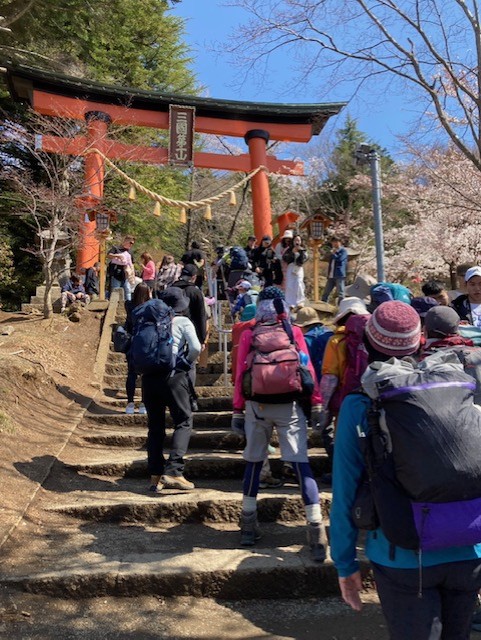 コメント:昨年4月の計画は雨予報で中止した。今回は12日晴、13日は曇~雨予報。新倉山~尾根までが健脚コース、12日は晴予報なので実施しました。翌日は天気次第で予定通り清八峠へ歩くか予定を変更して河口湖に下山する予定だった、駅から新倉富士浅間神社の五重塔「忠霊塔」と雄大な「富士山」と桜が一目に見える事が大絶賛のスポットとあり、インバウンドの観光客で大渋滞でした。歩行規制が引かれお陰で遠周りさせられた。