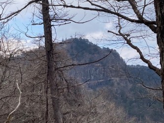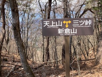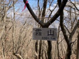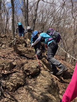 コースは新倉山までは普通の登山道だが山頂からの急降下、ロープが張られており有り難い!慎重に通過する。標高1150m~1200m辺りは急登でロープが張られ足場は悪い。稜線直下も岩の急登でロープが張られ慎重に登り上げ霜山でランチを摂る。