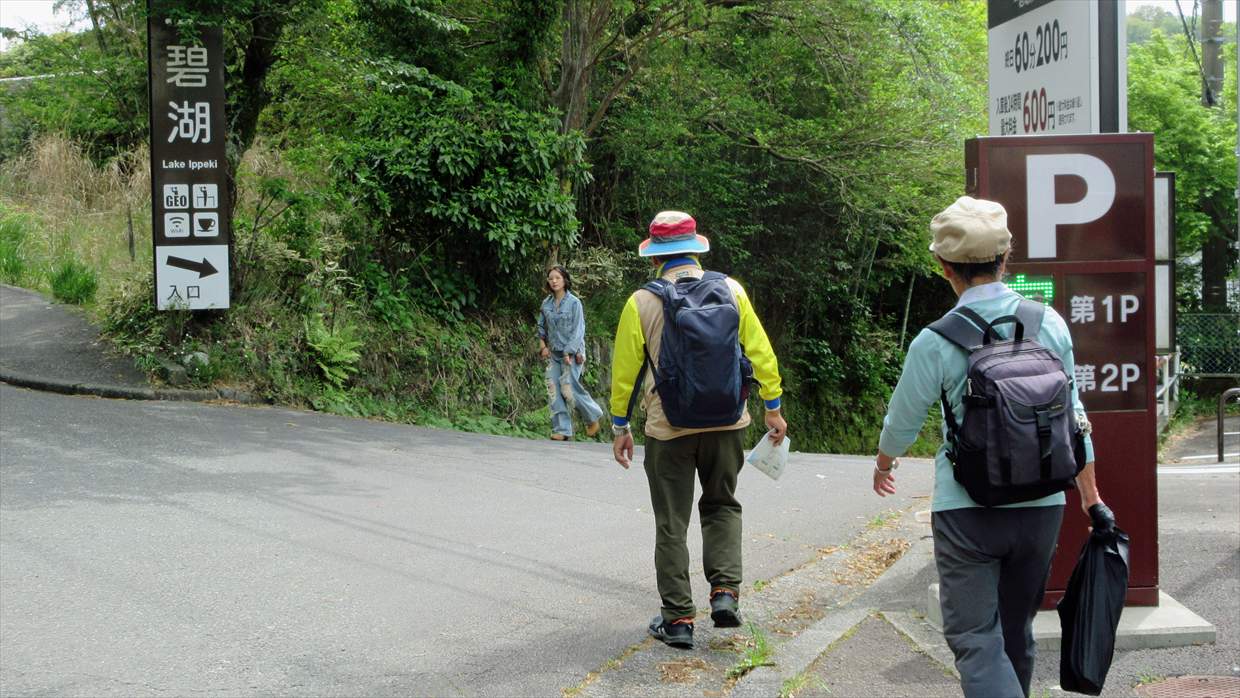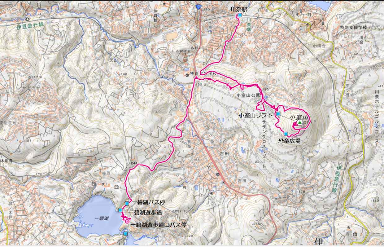 11:30小室山11:48→12:18つばき園入口→12:30国道(135号線)出合→13:10一碧湖(昼食)14:02→14:10一碧湖遊歩道口バス停=伊東駅