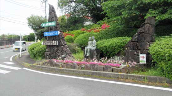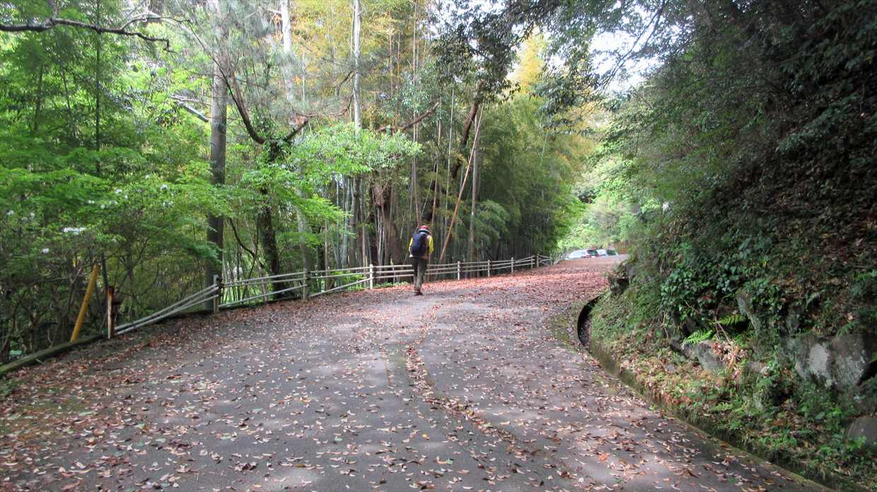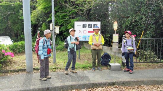一碧湖遊歩道口バス停。ザックに大きな夏みかんをいっぱい詰めて、小室山公園経由で伊東駅へ。