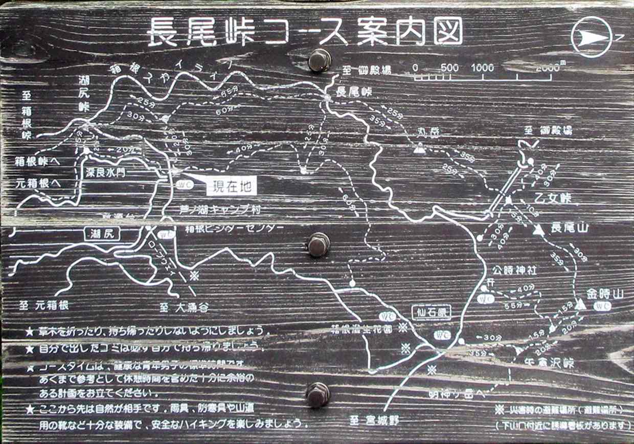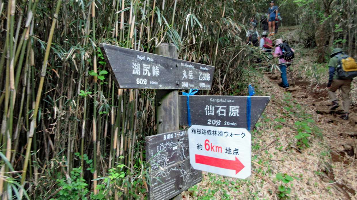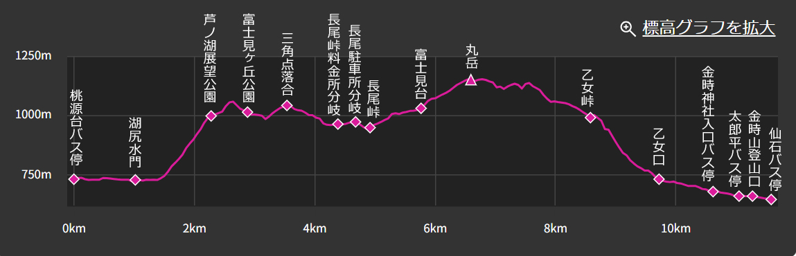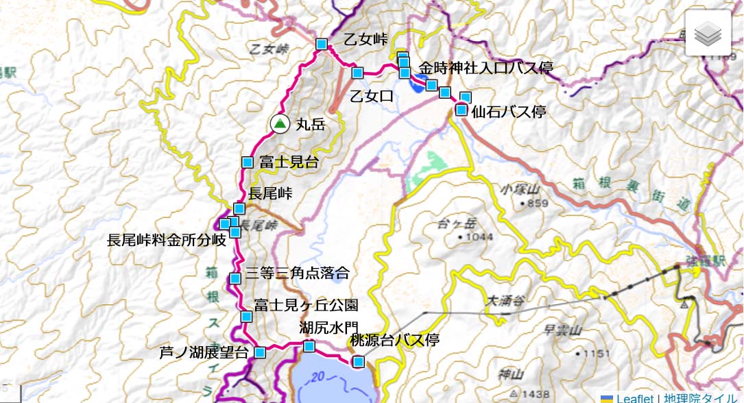 小田原駅=桃源台バス停10:20→湖尻水門10:36→芦ノ湖展望台→11:58富士見ヶ丘公園(昼食)12:24→長尾峠13:14→13:55丸岳14:10→14:46乙女峠15:07→乙女口14:06→16:30仙石バス停