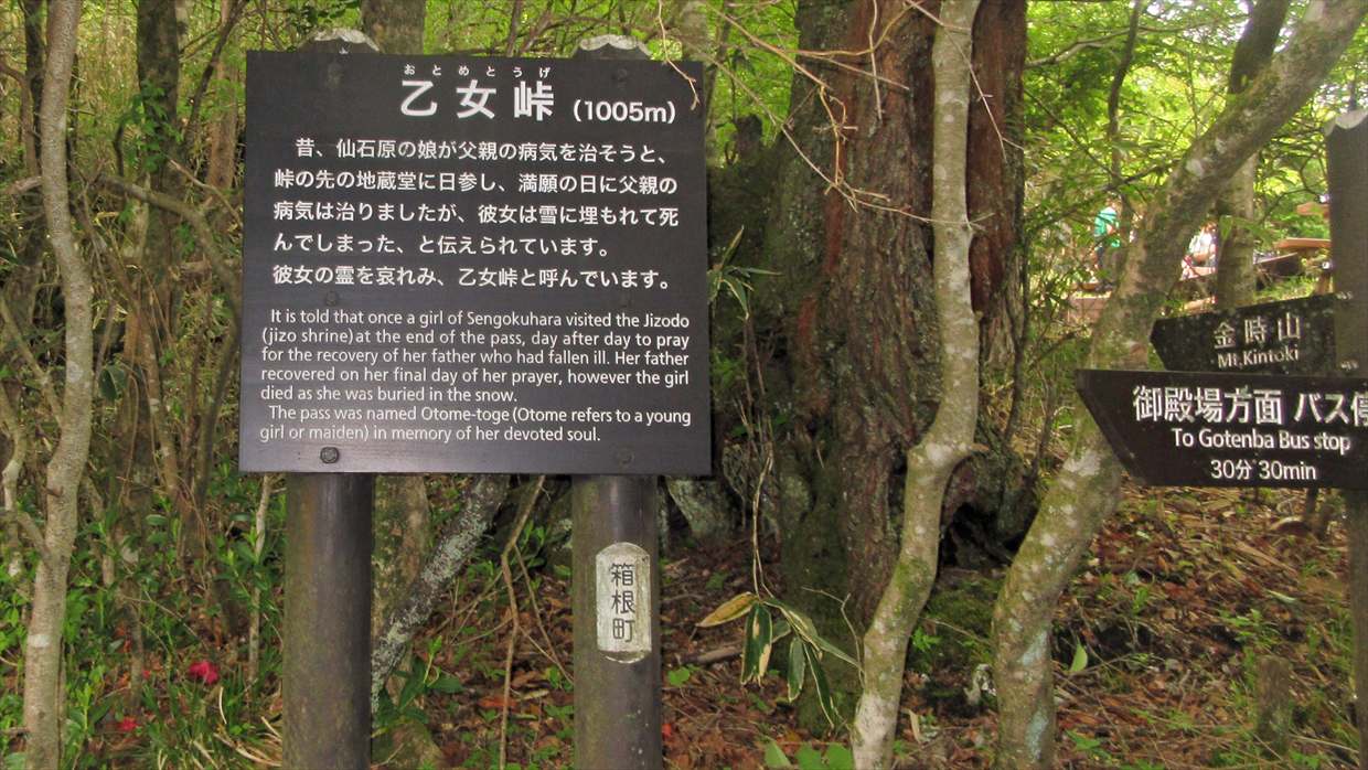 昔、仙石原の娘が父親の病気を治そうと、峠の先の地蔵堂に日参し、満願の日に父親の病気は治りましたが、彼女は雪に埋もれて死んでしまった、と伝えられています。彼女の霊を哀れみ、乙女峠と呼んでいます。
