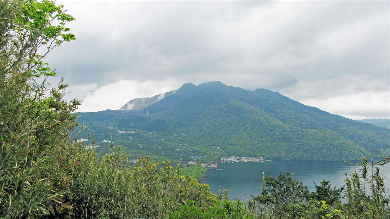 湖尻展望台から芦ノ湖を眺めると、右より駒ケ岳、神山、冠ヶ岳の中央火口丘が連なって見える。大涌谷は噴煙をたなびかせていた。