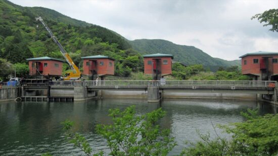 湖尻水門は、芦の湖及び早川における治水安全度の向上を目的に、効率的な洪水調節を行う施設として、1987年(昭和62年度)に工事着手し、1990年(平成2年)10月に完成しました。