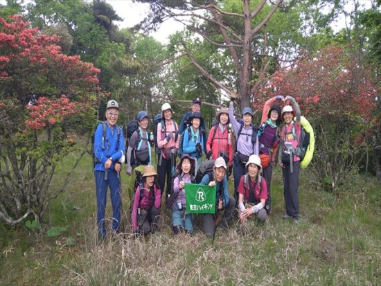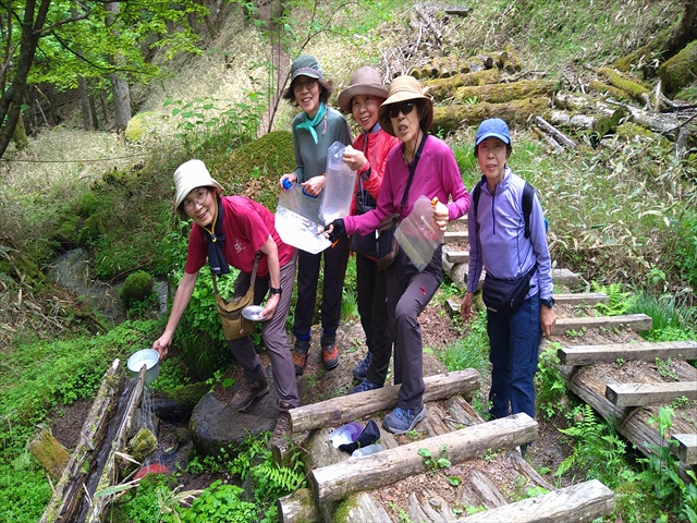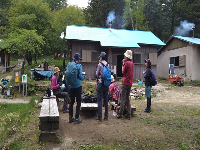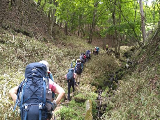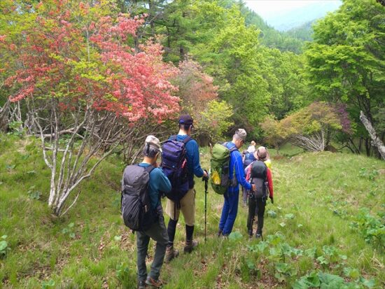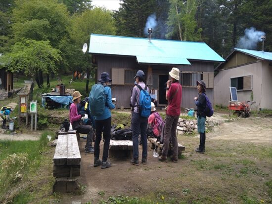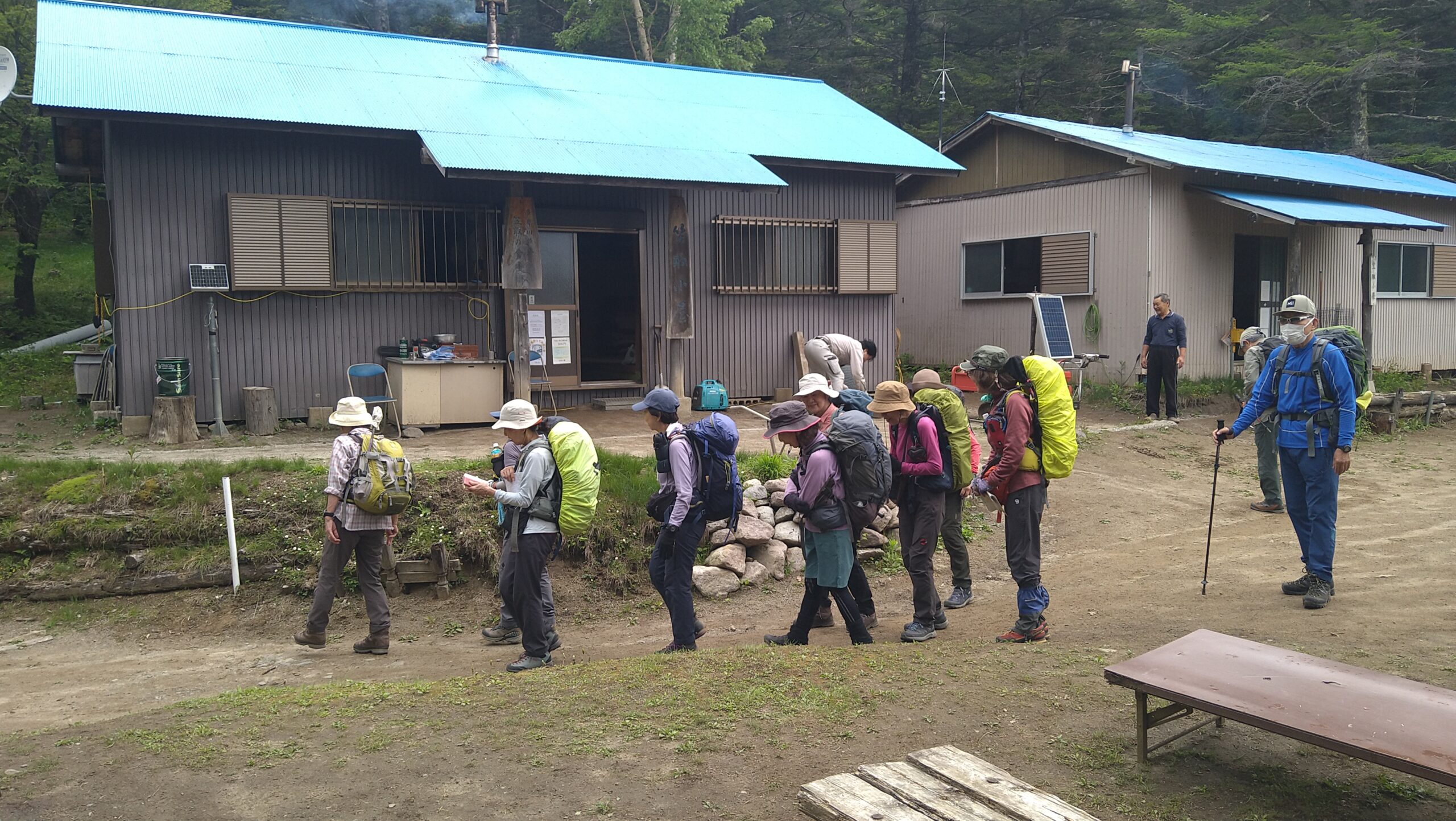 7日:コースは東京都が所有管理している多摩川源流域である。甲州・武州の領地視察の役人が国境である山の上で、笠を取り合って挨拶を交わしたことから名が付いたという笠取山を目指す。よく整備された登山道と新緑の樹木の森、賑やかなハルゼミの鳴き声の出迎えだ。苔とクリンソウも愛らしい。小屋に不要物を預けてまずは小さな分水嶺の丘。ここに降る雨は石碑の荒川、富士川、多摩川の字面方面に分かれて流れていくのだという。進んで水干。沢の行き止まりの意味で多摩川の最初の一滴が始まるところとして知られている。ここからは道は注意も必要に変わるが先並ぶミツバツツジと終わりかけのシャクナゲが素晴らしい!笠取山から戻り小屋に着いた後は共に夕飯の用意をしノンビリと食を囲んだ。