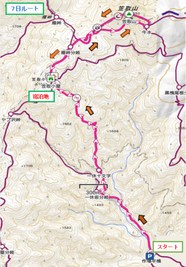 ▼コース : 7日 塩山駅9:30 タクシー=作場平10:40→12:10笠取小屋13:00昼食→水干13:15→笠取山頂14:00→笠取小屋15:00 (泊)