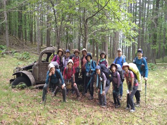 短縮するためには稜線のピークを越えることになり地図では分からないしんどさがあり。ここにはずっと会いたかったものがある。乗り捨てられた2台の廃ダッジトラックである。米軍払い下げを受けて材木運搬に使用されていたらしい。一台は林道短縮の地点だったため会えず。もう一台が白沢峠にある。やっと会えたトラックは落ち葉に埋もれながら荷台から木を生やし、ドアには銃弾の跡。写真通りの現物は嬉しい。後半は防火帯に沿いながら頂点を踏み、ヤマツツジに励まされながら柳沢峠に下山。今回も茶屋のみそおでんは美味しかった。 笠取小屋が素泊まりのみとは気づかず予定に組んで心配しましたが、余るほどの器具を自発的に持参して頂き感謝しかありません。とっても楽しい夕飯でした、皆様どうもありがとうございました。