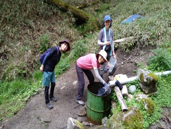 5リットル、2リトルのポリタン、コッヘルに湧き水を汲んで小屋へ持ち帰ります